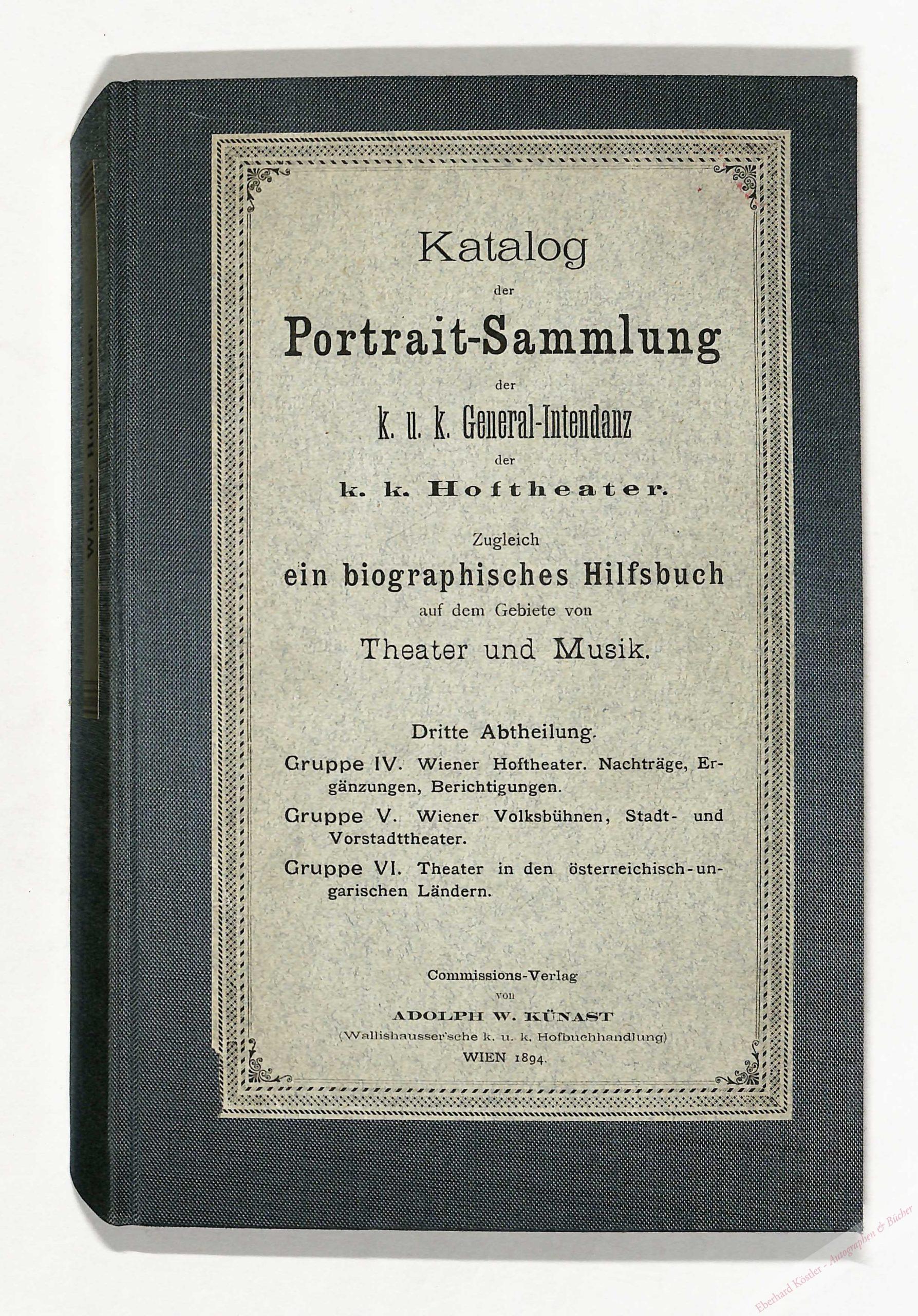 Seltenes Nachschlagewerk über österreichische Bühnenkümstler. – Umfasst: Regenten als Mäzene, Schauspieldichter und Theaterschriftsteller, Musiker, Wiener Hoftheater, Wiener Volksbühnen, Theater in den österr.-ungarischen Ländern. – Selten so umfangreich und mit dem meist fehlenden Register. – Titel gestempelt.