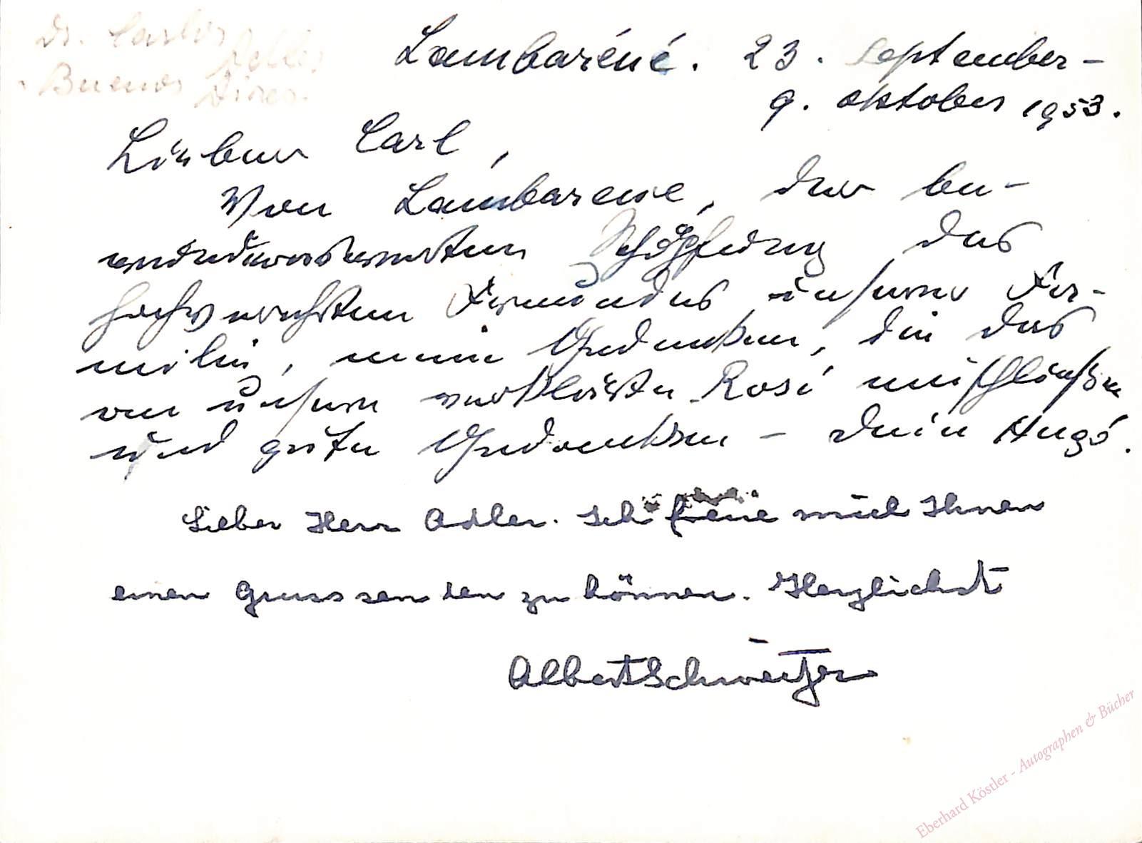 Für Carl Adler in Buenos Aires: „Lieber Herr Adler. Ich freue mich Ihnen einen Gruss senden zu können. Herzlichst Albert Schweitzer“. – Darüber eine ebenfalls an Carl Adler gerichtete Nachricht: „Von Lambarene, der bewundernstwerten Schöpfung des hochverehrten Freundes unserer Familie, mein Gedenken, die das an unsere verklärte Rosé einschließen und gute Gedanken – dein Hugó …“ – Das Foto zeigt Albert Schweitzer im Holzgerüst eines Hauses in Lambaréné, wo er von1953 bis 1955 in der Nähe seines Hospitals ein noch heute bestehendes Lepradorf baute. Finanziert wurde das Dorf durch das Geld, welches er für den Friedensnobelpreis von 1952 erhielt.