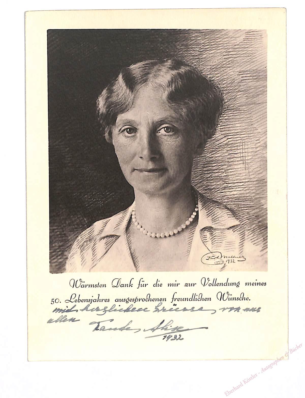 Mit gedrucktem Dank zu ihrem 50. Geburtstag und Beschriftung „mit herzlichen Grüssen von uns allen Tante Alix 1932.“