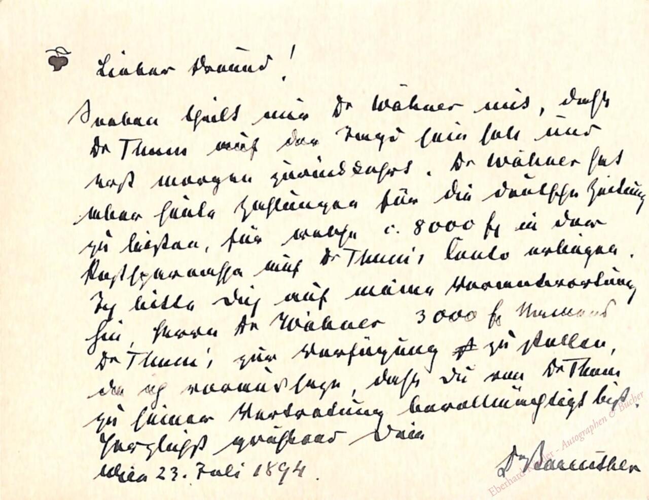 „Lieber Freund! Soeben theilt mir Dr Wähner mit, dass Dr Thum auf der Jagd sein soll und erst morgen zurückkehrt. Dr Wähner hat aber heute Zahlungen für die deutsche Zeitung zu leisten, für welche c. 8000 fr in der Postsparcassa auf Dr Thum’s Conto erliegen. Ich bitte Dich auf meine Verantwortung hin, Herrn Dr Wähner 3000 fr Namens Dr Thum, zur Verfügung zu stellen, da ich voraussetze, dass Du von Dr Thum zu seiner Vertretung bevollmächtigt bist. Herzlichst grüssend Dein Dr Bareuther.“ – Rückseitig roter Sammlungsstempel.