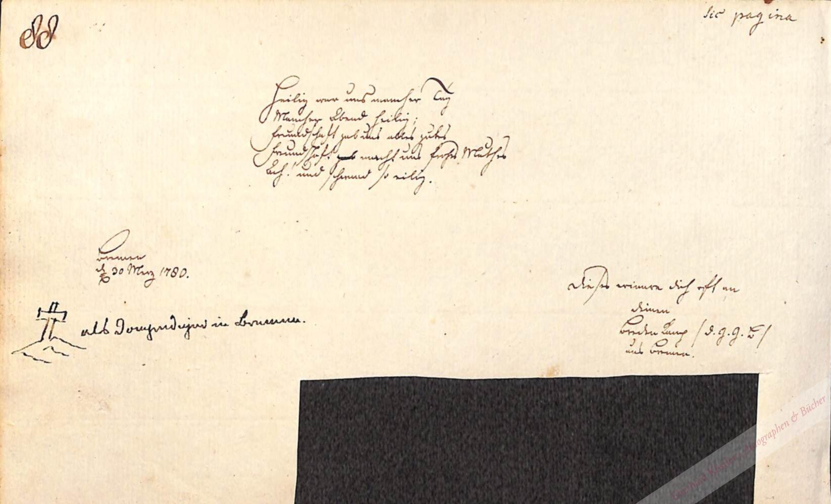 „Heilig war uns mancher Tag Mancher Abend heilig; Freundschaft gab uns alles gutes Freundschaft macht uns frohes Mutes. Ach! und schwand so eilig.“ – Bredenkamp versah ein Amt als Domprediger in Bremen. – Aus dem Album Daniel Schütte. Rückseitig Albumblatt von Max Karl Alexander von Krane (ca. 1760-1838); Textverlust durch Ausschnitt.