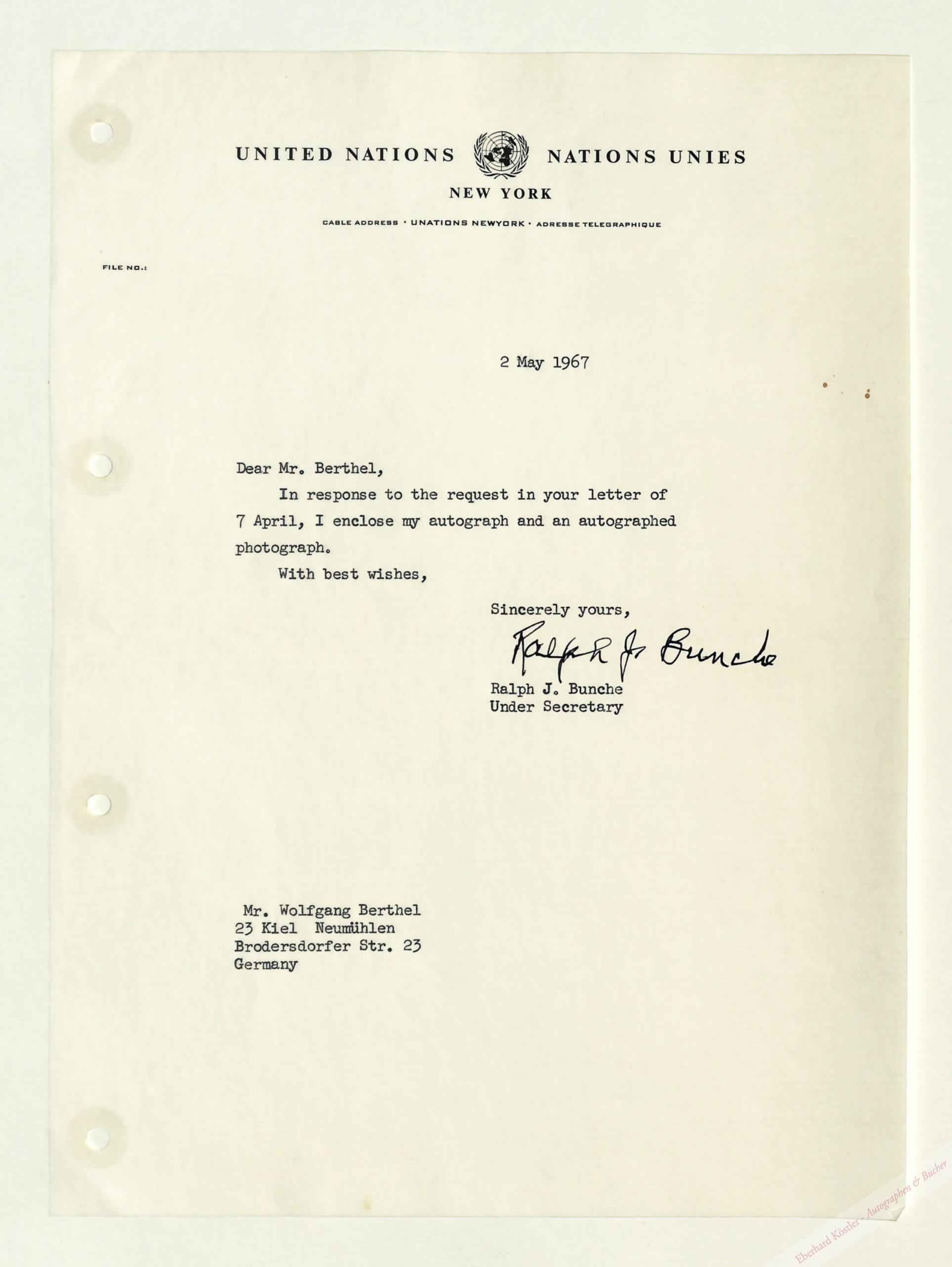 An einen Sammler. – Bunche erhielt den Friedensnobelpreis 1950.