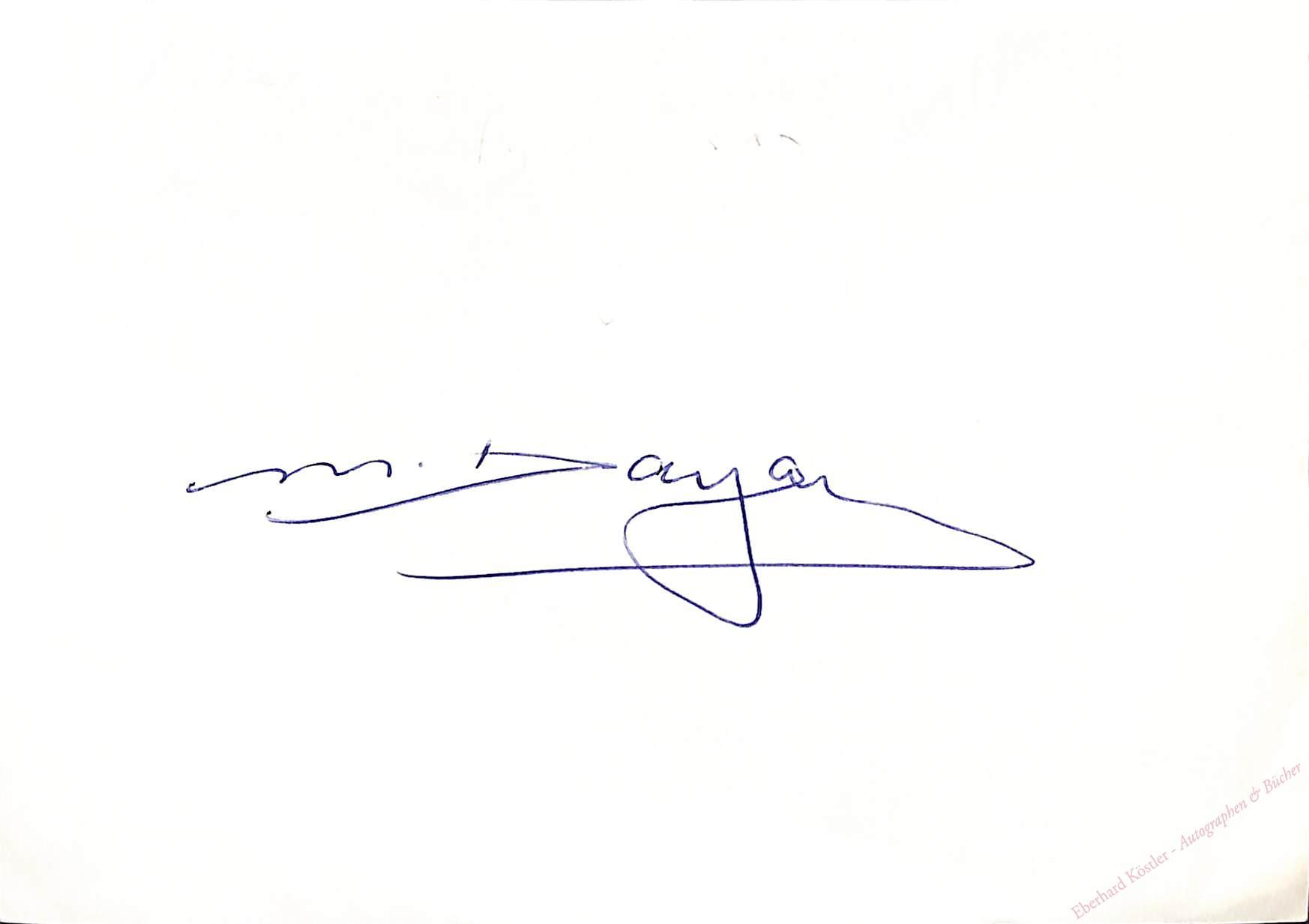 Eigenh. Namenszug „M. Dayan“ als Albumblatt. Tel Aviv, 1976 (Poststempel), 10,5 x 14,5 cm. Umschlag.