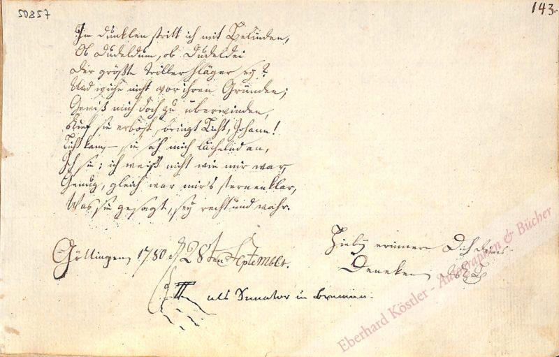 Aus dem Album von Daniel Schütte mit einem weiteren Eintrag auf der Rückseite und einem Blatt mit Aquarell, das wohl ebenfalls von Deneken stammt. – Deneken veröffentlichte Bücher zur Bremischen Geschichte, etwa 1828 über den Bremer Roland und 1831 über das Bremer Rathaus.