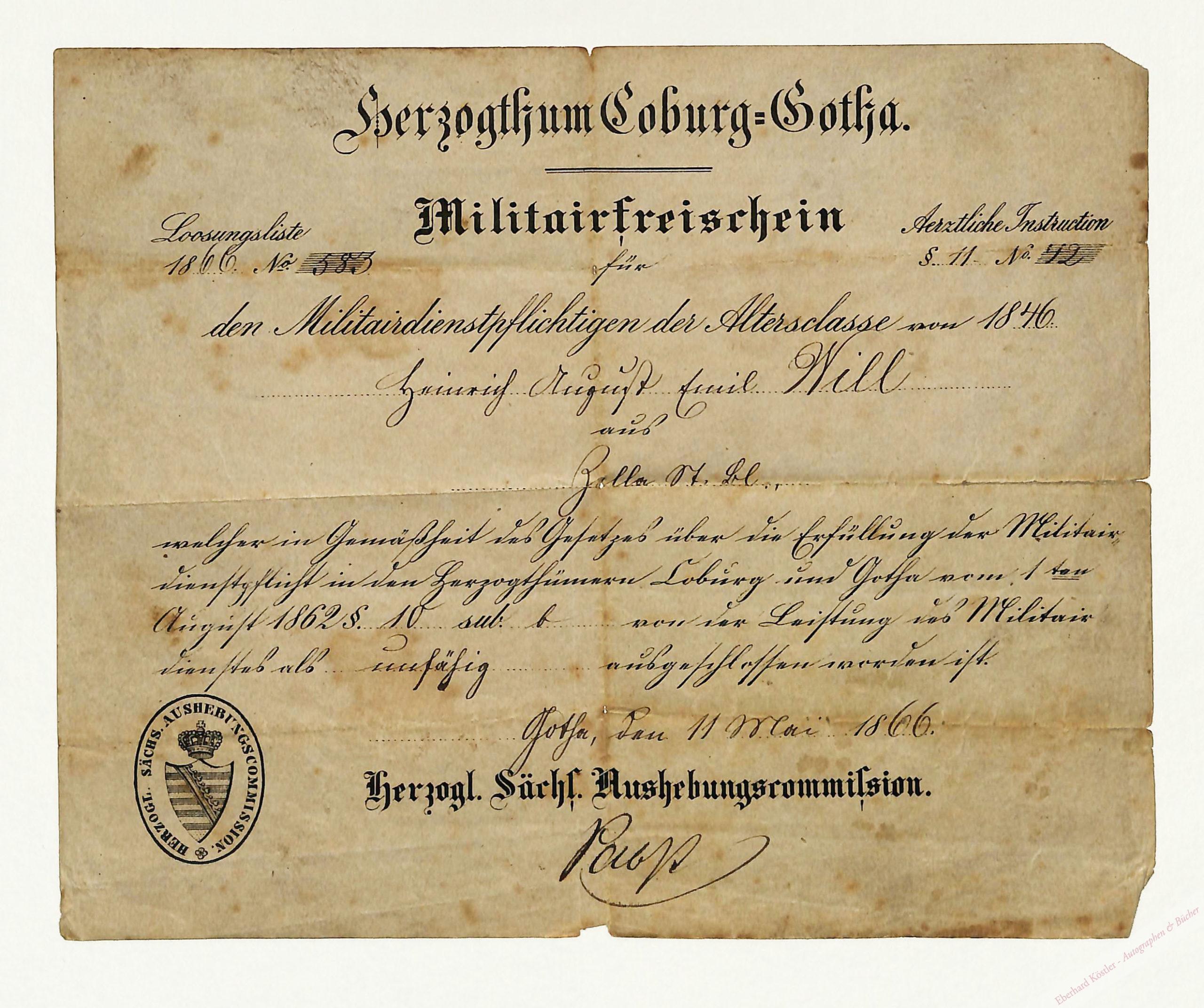 „Militärfreischein“ des Hezogtums Coburg-Giotha für Heinrich August Emil Will aus Zella: „unfähig“. – Etw. fleckig.