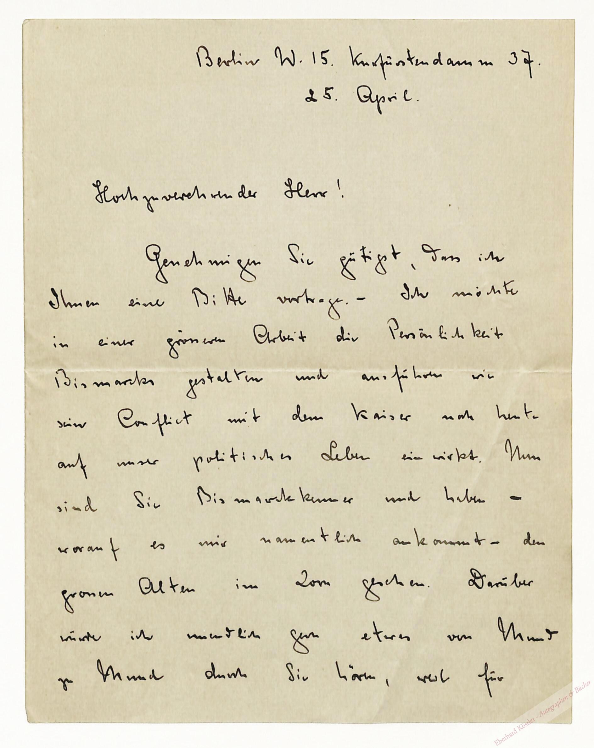 An Maximilian Harden: „[…] Ich möchte in einer größeren Arbeit die Persönlichkeit Bismarcks gestalten und ausführen wie sein Conflict mit dem Kaiser noch heute auf unser politisches Leben einwirkt. Nun sind Sie Bismarckkenner und haben […] den großen Alten im Zorn gesehen. Darüber würde ich unendlich gern etwas von Mund zu Mund durch Sie hören, weil für mich das Gespräch noch besser als die Schilderung mit der Feder eine Persönlichkeit aufleben lässt […]“
