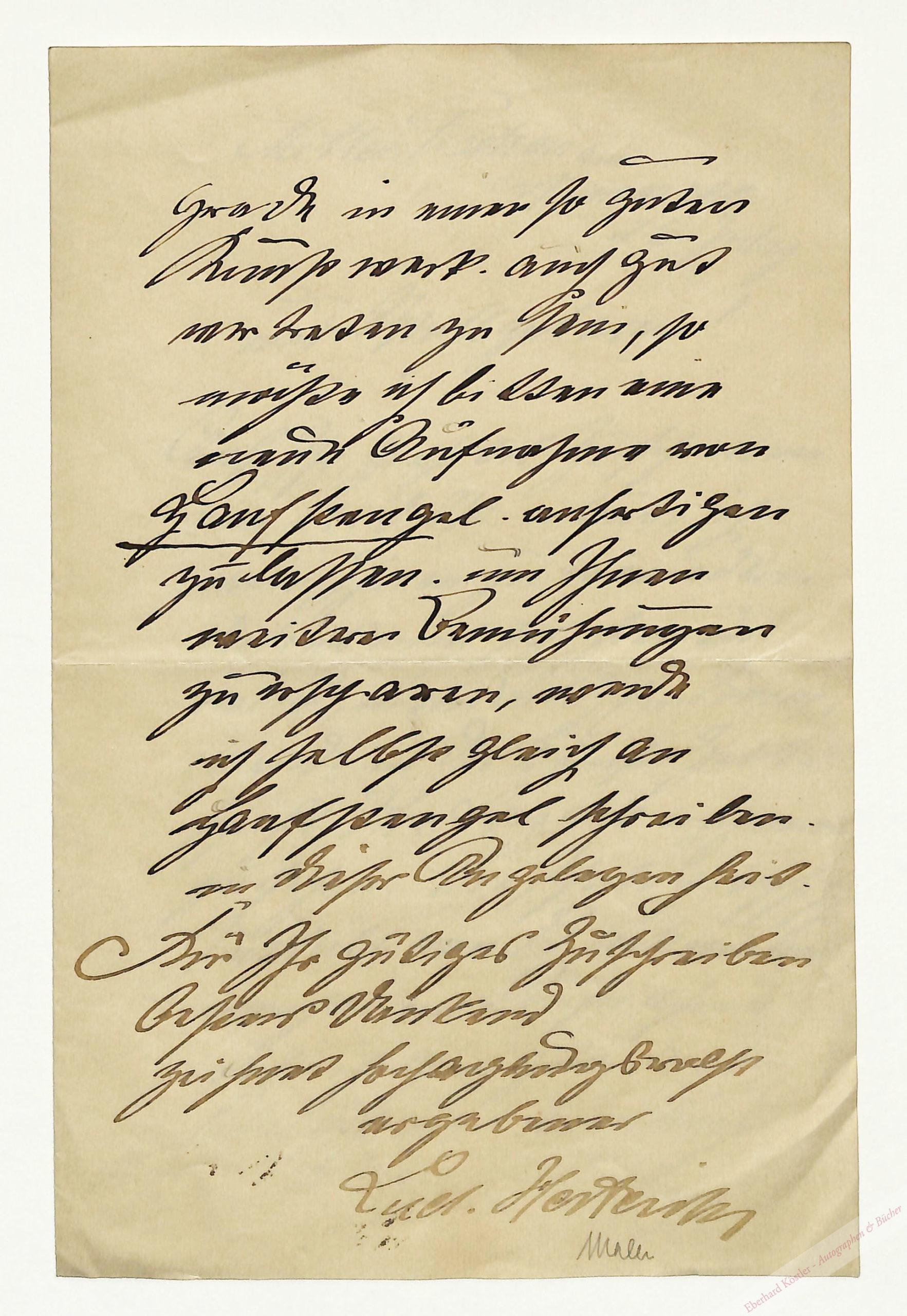 Dank für die Abbildung des Gemäldes „Ein Sommerabend“ (entstanden um 1895) in der Kunstzeitschrift „The Studio“, wofür „die Photographische Anstalt von Bruckmann“ Aufnahmen anfertigen soll. – Ludwig von Herterich, 1908 mit dem Maximiliansorden ausgezeichnet und in den Adelsstand erhoben, war ein führender Repräsentant der Münchner Schule. Er war unter anderem maßgeblich an der bildkünstlerischen Ausgestaltung vom Schloss Wolfsbrunn im Erzgebirge beteiligt.