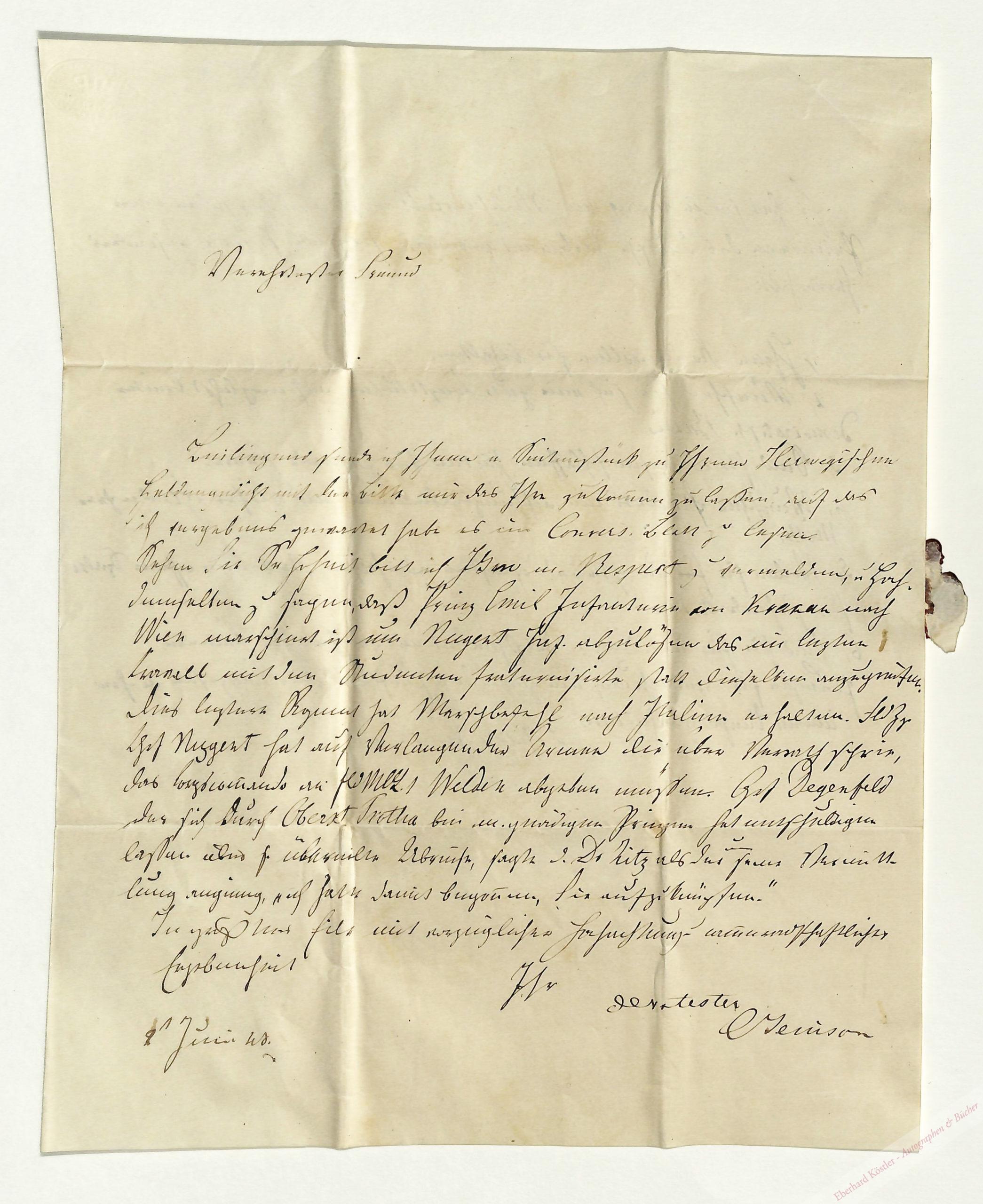 An den General Emil zu Sayn-Wittgenstein-Berleburg (1824-1878) in Darmstadt: „[…] Beiliegend sende ich Ihnen e. Seitenstück zu Ihrem Herwegischen Heldengedicht mit der Bitte mir das Ihre zukommen zu laßen, auf das ich vergebens gewartet habe es im Convers. Blatt zu lesen. Sehen Sie Se. Hoheit bitt ich Ihm m. Respect zu vermelden, u. Hochdemselben zu sagen, daß Prinz Emil Infanterie von Krakau nach Wien marschiert ist, um [Laval von] Nugent [1777-1862] Inf[anterie] abzulösen das im lezten Cravall mit den Studenten fraternisirte statt dieselben anzugreifen. Dies leztere R[egiment] hat Marschbefehl nach Italien erhalten. […] Nugent hat auf Verlangen der Armee, die über Verrath schrie, das Corpscommando an […] Welden abgeben müssen. Gr[a]f Degenfeld der sich durch Oberst Trotha bei m[einem] gnädigen Prinzen hat entschuldigen lassen über s[eine] übereilte Abreise, sagte d[em] Dr. Ritz als der um seine Vermittlung anging, ‚ich habe damit begonnen Sie aufzuknüpfen‘ [… Nachschrift:] Es hat sich in Leipzig ein Mädchenclub constituirt der sich in einer Petition an das Deutsche Parlament gewendet und folgende Punkte besonders hervorhebt: 1) Ihren König wollen sie behalten. 2) wünschen Sie sich eine gute Constitution auf möglichst breiter demokratischer Basis. 3) Sind sie in diesen schlaffen Zeiten für stehende Heere. 4) Wünschen sie stets ein achtungsgebietendes männliches Glied in ihrer Mitte. 5) Wollen sie um ihren Bedürfnissen abzuhelfen, stets eine offene Spalte für stehende Article. 6) Sind sie für unbedingte Preßfreiheit mit geöffneten Kammern. 7) Legen sie Verwahrung ein gegen den Einfluß der Franzosen in ihre inneren Angelegenheiten […]“ – Beiliegend ein Zeitungsausschnitt vom 25. Mai 1848 über die Mainzer Turnerschaft und ihre antipreussische Haltung.