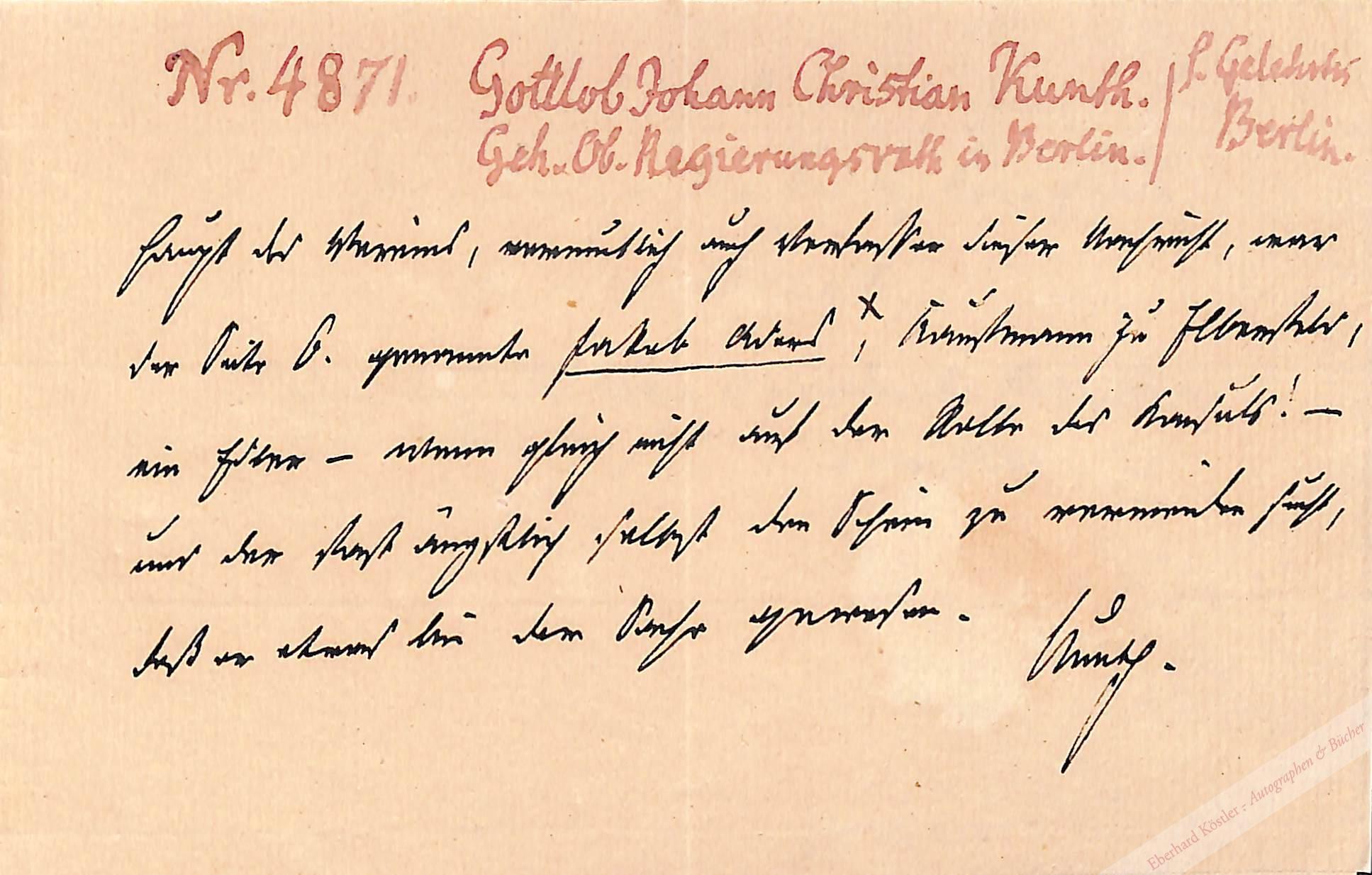 „Haupt des Vereins, vermutlich auch Verfasser dieser Nachricht, war der Seite 6. genannte Jakob Aders [1768-1825], Kaufmann zu Elberfeld, ein Edler – wenn gleich nicht auf der Rolle des Konsuls! – und der fast ängstlich selbst den Schein zu vermeiden sucht, daß er etwas bei der Sache gewesen.“ Gemeint ist wohl der 1816 in Folge einer Hungersnot gegründete „Elberfelder Kornverein“, der es möglich machte, durch günstigen Einkauf und Lagerung größerer Getreidemengen den Brotpreis niedrig zu halten und so ein größeres Elend zu vermeiden. – Kunth ist heute vor allem als Erzieher und väterlicher Freund der Humboldt-Brüder bekannt. – Aus der Sammlung Rötger.