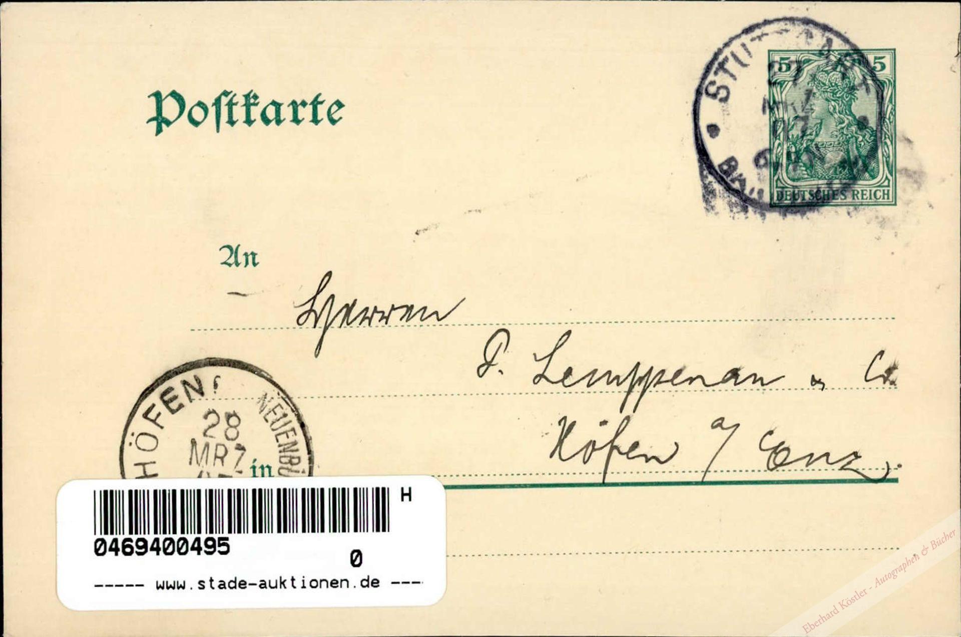 Eigenh. Postkarte mit Unterschrift Feuerbach in Württemberg, 27. III. 1907, 1 Seite. Briefkopf mit Holzstichvignette „Mechanik der Leitz-Ordner ‚A‘ mit Rolle“.