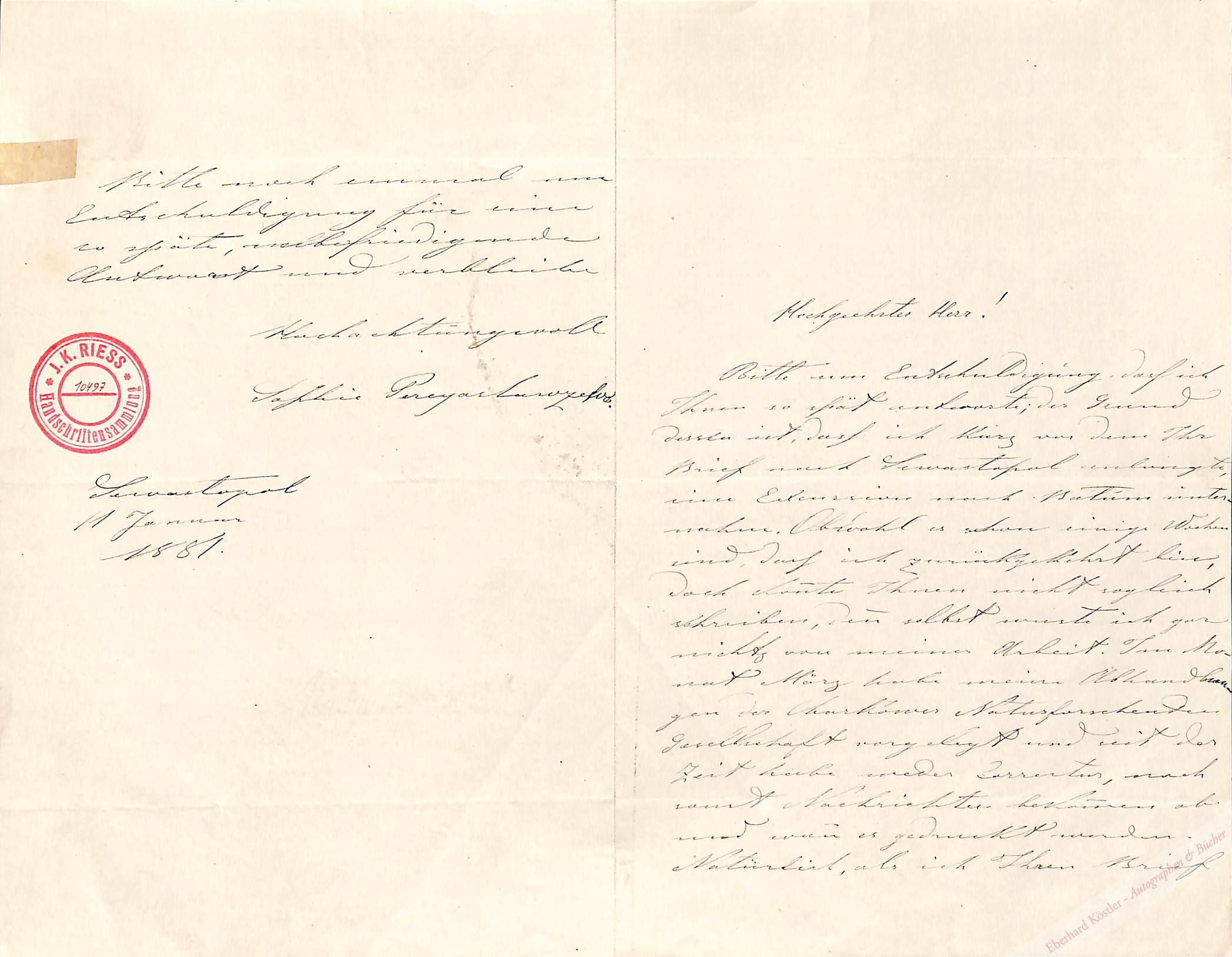 Eigenhändiger Brief mit Unterschrift „Sophie Pereyaslawzewa“. Sewastopol, 11. I. 1881, 8°. 3 1/2 Seiten. Doppelblatt.