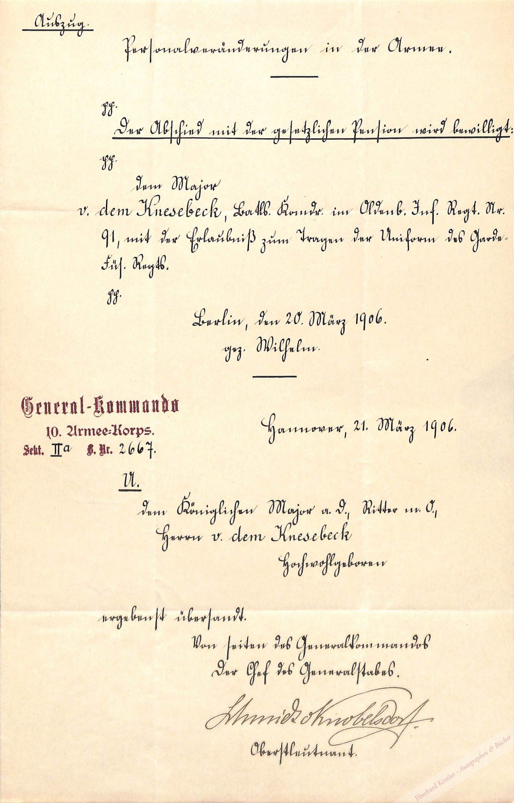 Schriftstück mit eigenhändiger Unterschrift Hannover, 20. III. 1906, Fol. 1 Seite. Doppelblatt mit Adresse. – Bewilligung des Abschieds..