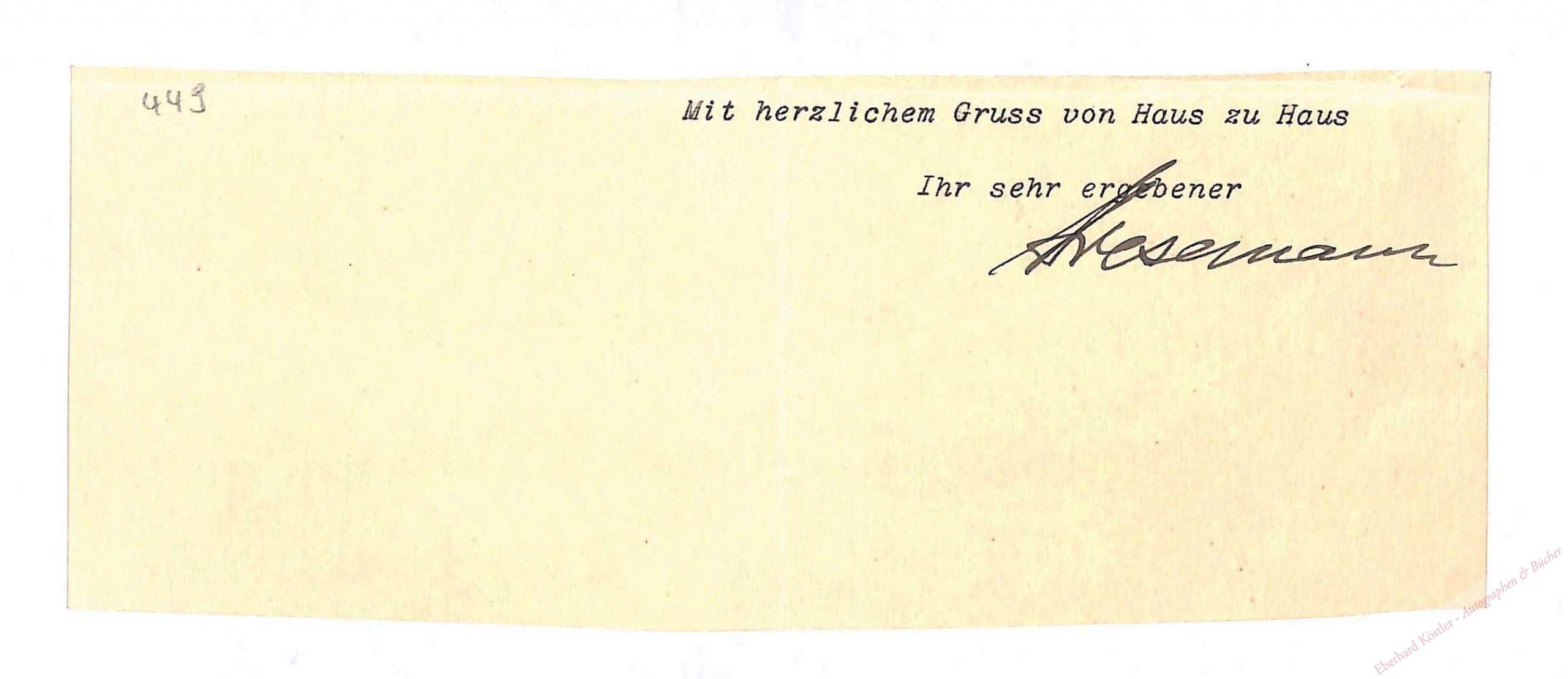 Maschinengeschriebener Briefabschnitt mit eigenhändiger Unterschrift , Ohne Ort und Jahr, 8 x 20,5 cm. – Grußwort..
