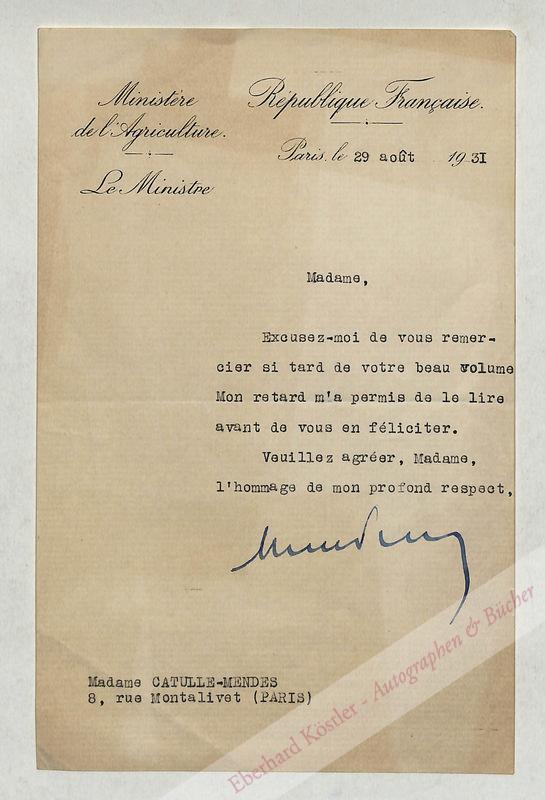 An Madame Catulle-Mendes in Paris, dankt für die Zusendung eines Buches: „[…] Mon retard m’a permis de le lire avant de vous féliciter […]“ – Tardieu war während der Friedensverhandlungen 1919 Berater Georges Clemenceaus, spielte danach eine zentrale Rolle in der französischen Politik, unter anderem als Minister für öffentliche Arbeiten und Innenminister. Zwischen 1929 und 1930 war er Ministerpräsident, von 1930 bis 1931 Minister für Landwirtschaft, danach Kriegsminister.