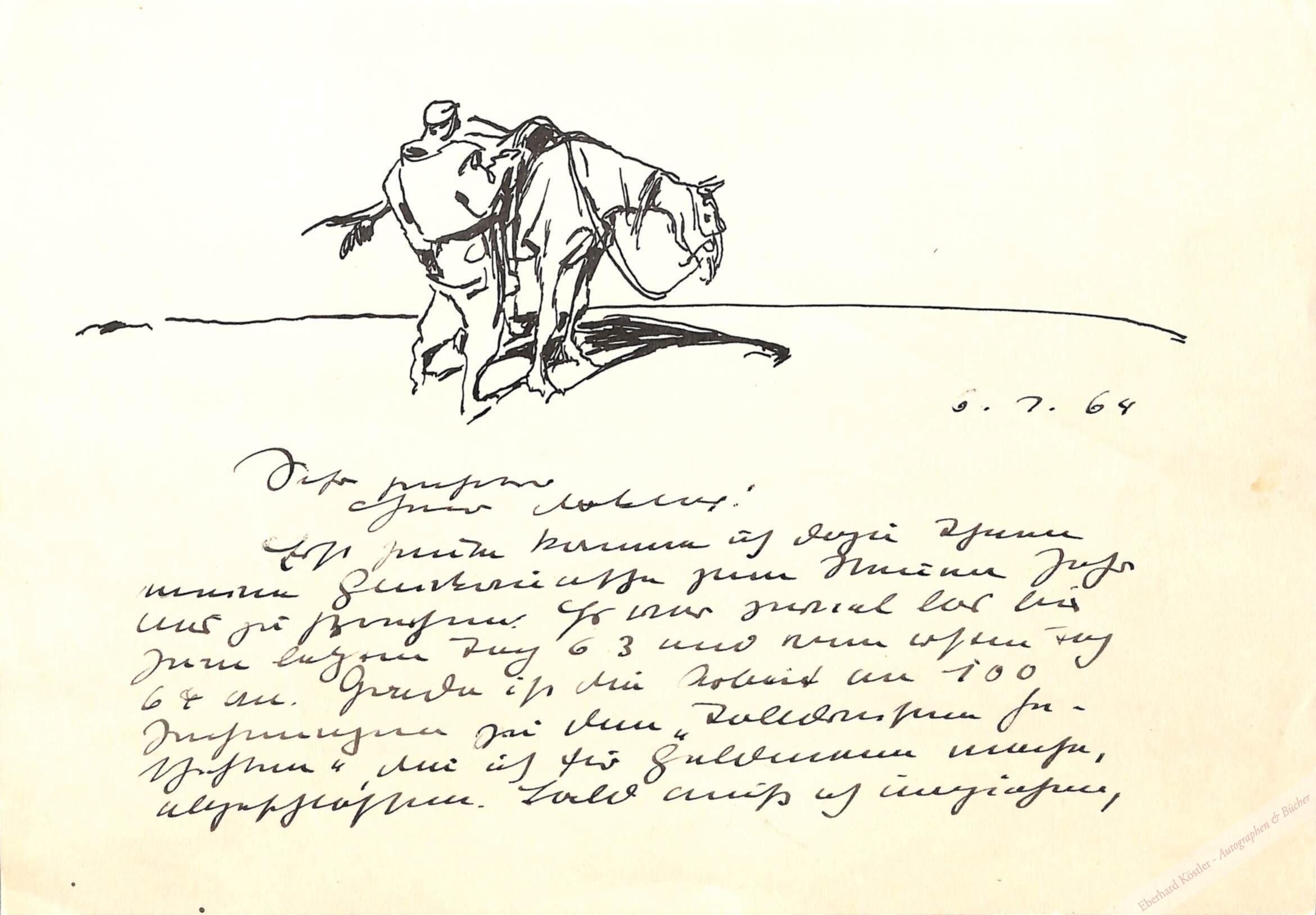 Reizvoll illustrierte Neujahrglückwünsche, mit den Originalzeichnungen „Reiter sattelt ein Pferd“ und „Der Künstler arbeitend“. Busch berichtet ferner über über seine aktuellen Arbeiten zu den „Tolldreisten Geschichten“ und „Manon Lescaut“. – Der Adressat Erich Müller-Kamp war Slawist und Germanist, Herausgeber der Manesse-Bibliothek und Lektor des Bücherbundes.