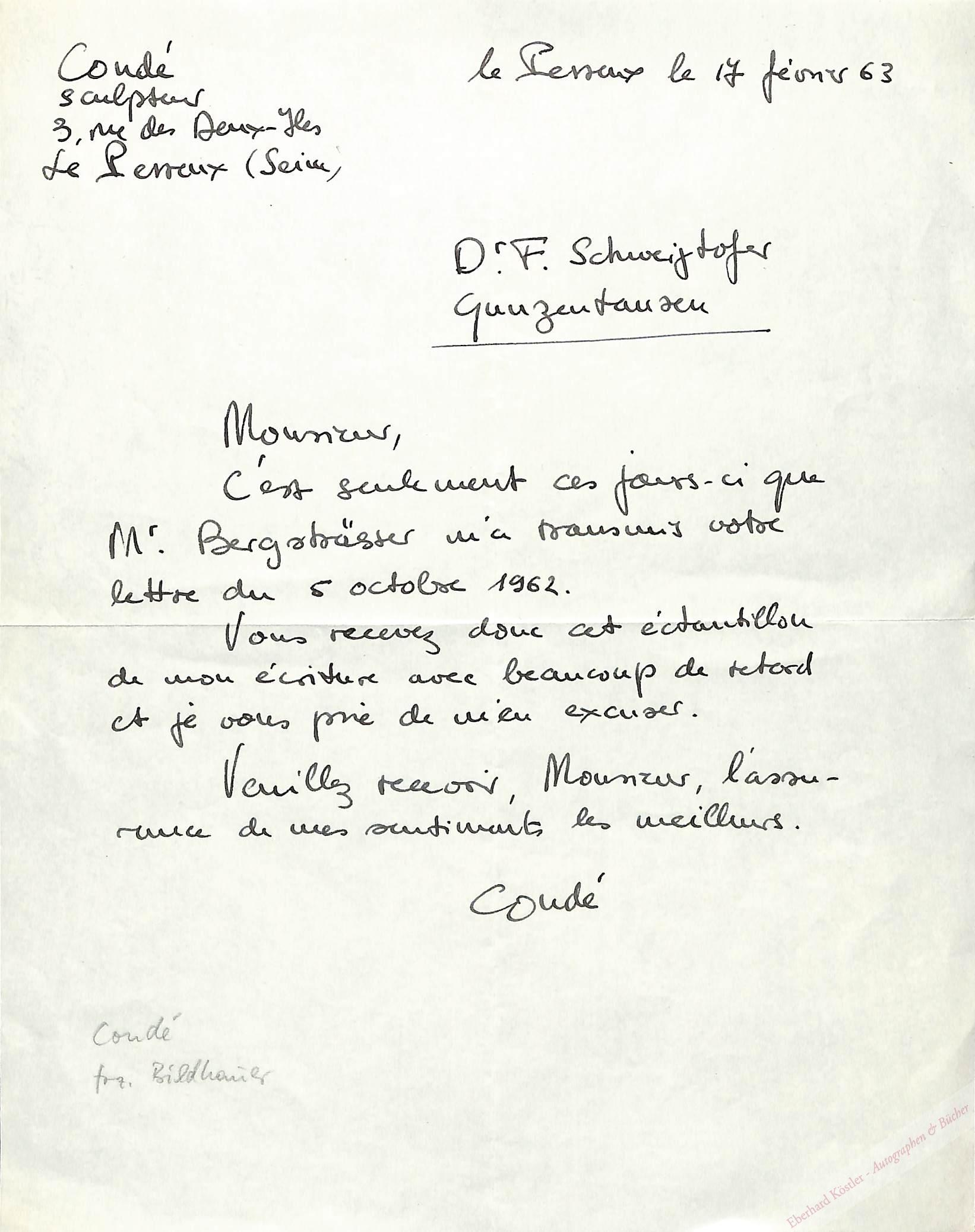 An einen Graphologen. – Der Bildhauer und Grafiker Condé wanderte nach Lehrjahren in La Chaux-de-Fonds 1946 nach Paris aus. Dort studierte er bei der berühmten Bildhauerin Germaine Richier.