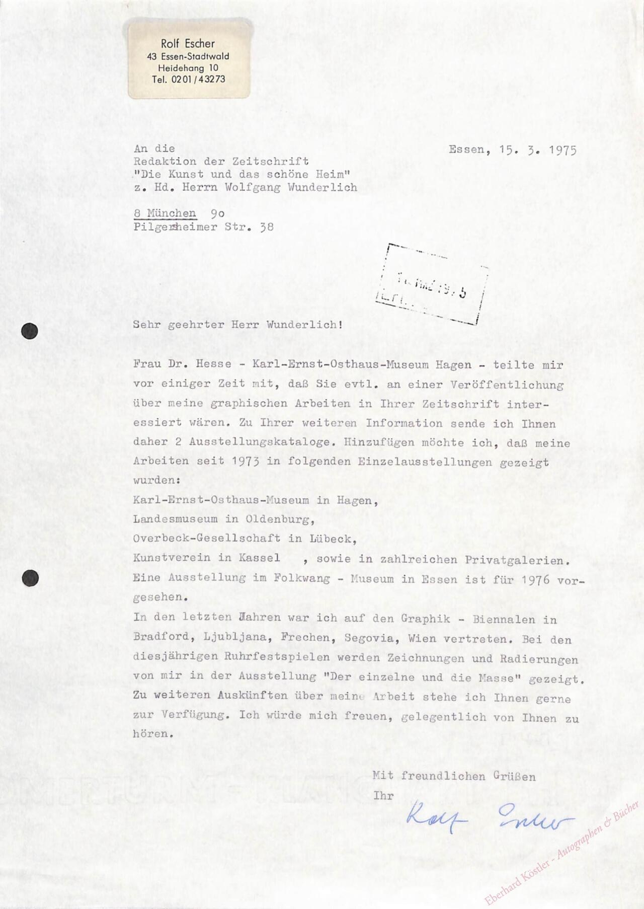 An den Herausgeber der Zeitschrift „Die Kunst“ wegen der Veröffentlichung seiner Grafiken. Übersendet Kataloge und nennt seine Ausstellungen. Escher arbeitet auch als Buchillustrator. – Beilage: Sonderdruck der Veröffentlichung.