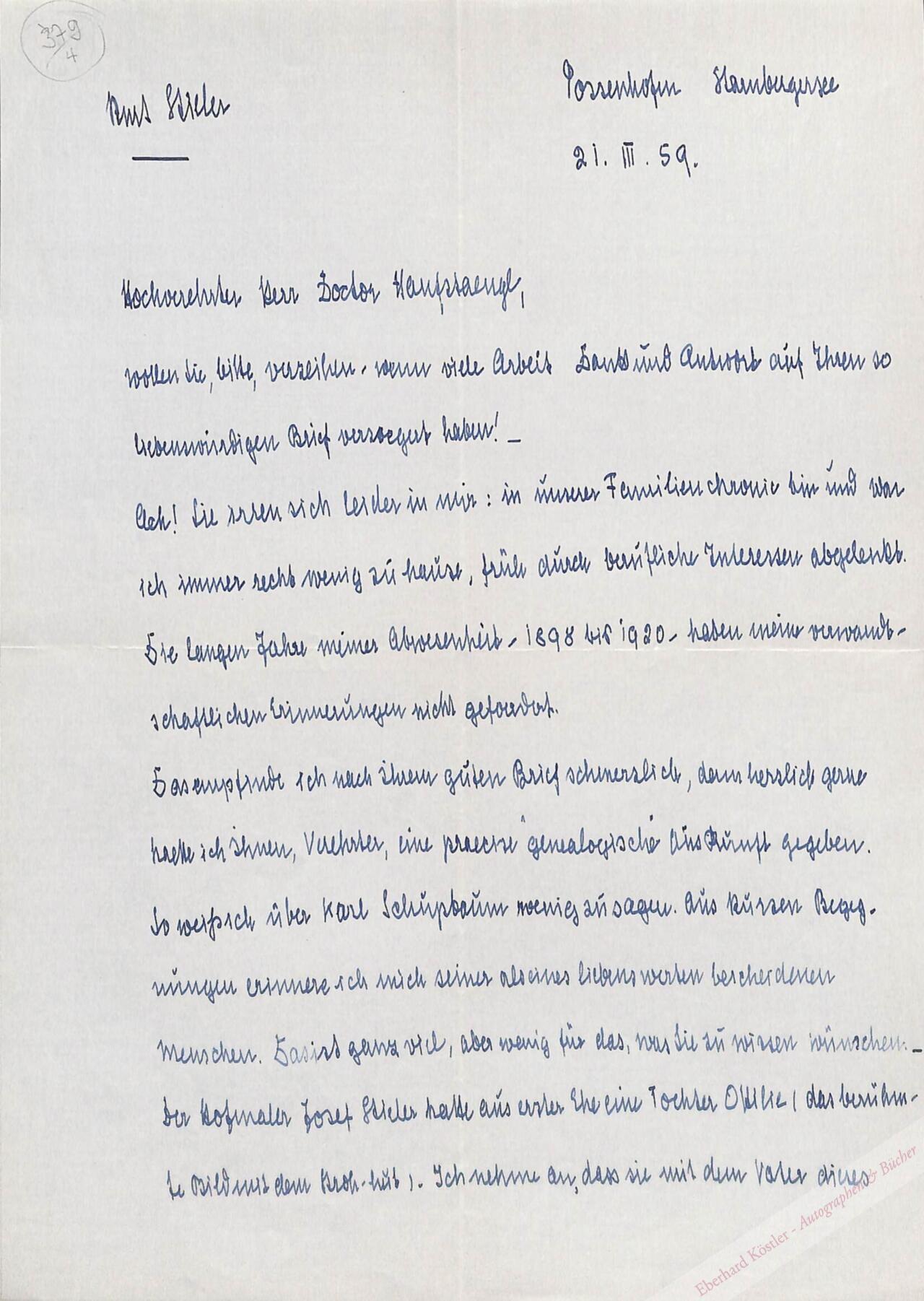 I. Stieler bedauert, daß er Doktor Hanfstaengl keine „praecise genealogische Auskunft“ geben kann, auch über Karl Schupbaum kann er wenig sagen: „[…] Der Hofmaler Josef Stieler hat aus erster Ehe eine Tochter Ottilie (das berühmte Bild mit dem Stroh-Hut). Ich nehme an, dass sie mit dem Vater dieses Karl Schupbaum verheiratet war […]“ Er empfiehlt für weitere Auskünfte Prof. Alexander von Müller in Rottach-Egern. – II. Stieler bedankt sich überschwenglich: „[…] Die Freude, die Ihr Rembrandt mir geschenkt hat ist zu nachhaltig […]“ Freut sich, daß Prof. von Müller Hanfstaengls Fragen beantworten konnte.