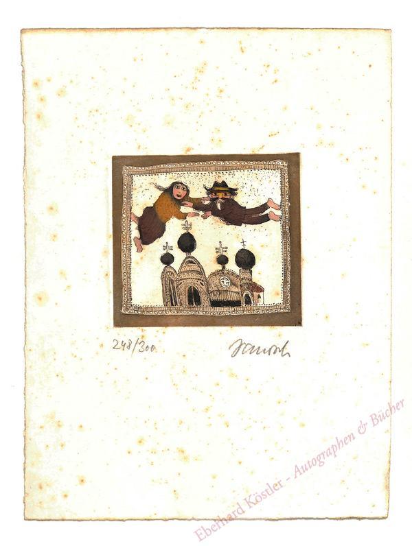 Nr. 248 von 300 Exemplaren. – Schwebendes älteres Paar (Janoschs bekannte Figur „Onkel Poppoff“) über dem Dach einer orthodoxen Kirche. – Etwas stockfleckig. – Hübsch.