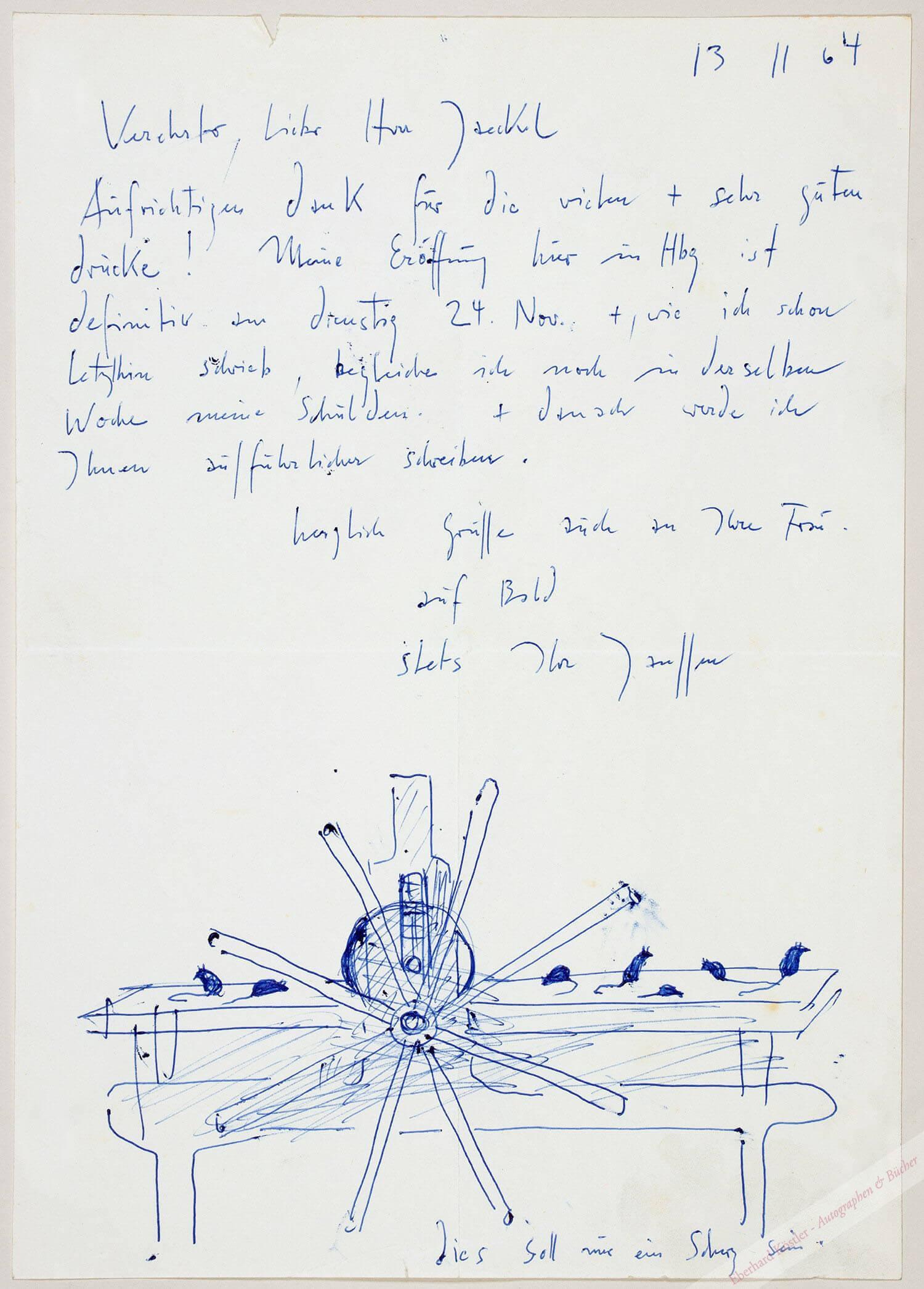 Janssen zeichnet für Herbert Jaeckel (1907-1998) in Worpswede eine Druckerpresse, auf der weiße Mäuse um eine Wein- oder Schnapsflasche tanzen. Bildunterschrift: „Dies soll nur ein Scherz sein“. Dazu schreibt er: „Aufrichtigen Dank für die vielen + sehr guten Drucke! Meine Eröffnung hier in Hbg. ist definitiv am Dienstag 24. Nov. + wie ich schon letzthin schrieb, begleiche ich noch in derselben Woche meine Schulden + danach werde ich Ihnen ausführlich schreiben ..“ – Von Januar 1957 bis1965 veranstaltete Janssen „Treppenhausausstellungen“ in seiner Wohnung in der Hamburger Warburgstraße 33b, für die Jaeckel die Abzüge lieferte. – Herbert Jaeckel war der Neffe und Schüler des Malers und Grafikers Martin Paul Müller (1872-1936), der 1919 die Künstlerpresse Worpswede begründete. Nach dem Tod des Onkels übernahm er 1936 die Werkstatt und etablierte sie als zentrale Institution für Druckgrafik. Janssen und Jaeckel lernten sich Anfang der Sechzigerjahre in Worpswede kennen. Der Galerist Hans Brockstedt machte sie miteinander bekannt. Es folgte bis zum Zerwürfnis 1972 eine intensive, kreative und freundschaftliche Zusammenarbeit. – Bisher in Privatbesitz.