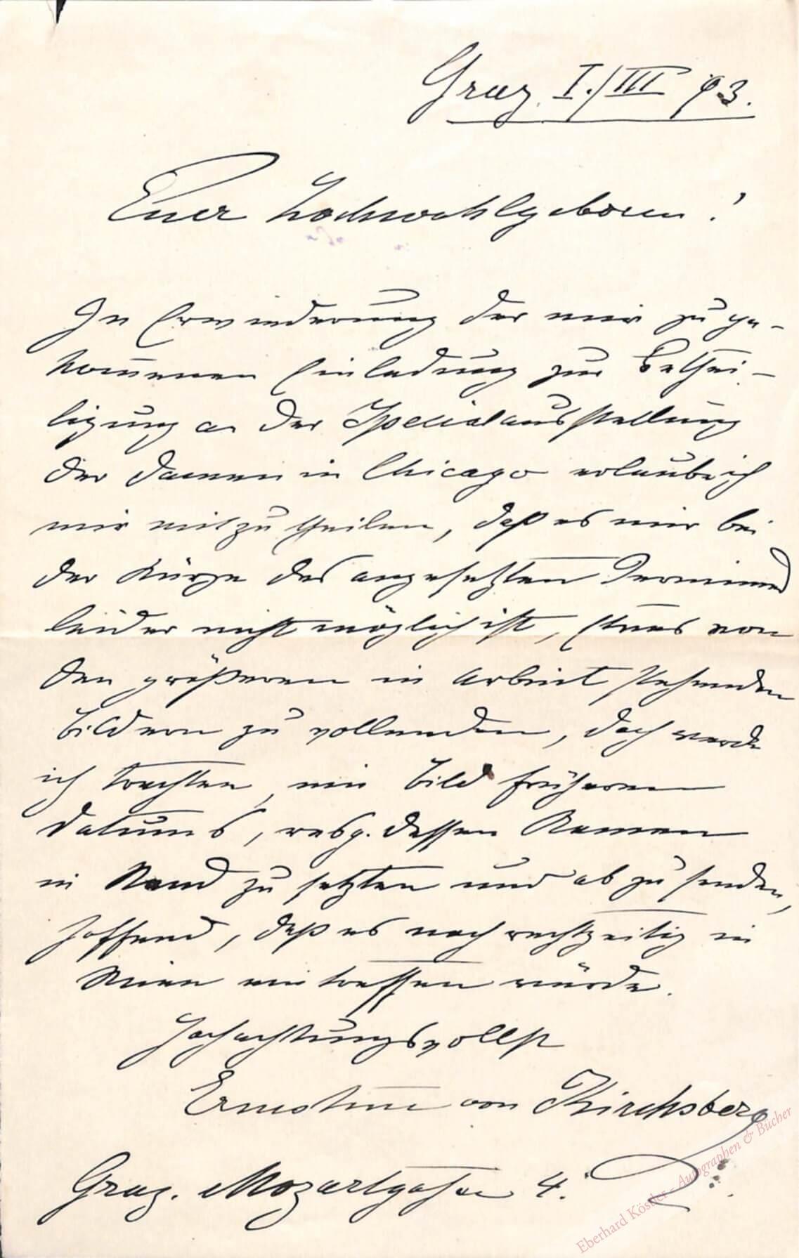 „[…] In Erwiederung der mir zugekommenen Einladung zur Betheiligung an der Specialausstellung der Damen in Chicago erlaube ich mir mitzutheilen, daß es mir bei der Kürze des angesetzten Termins leider nicht möglich ist, etwas von den größeren in Arbeit stehenden Bildern zu vollenden, doch werde ich trachten, ein Bild früheren Datums, resp. dessen Rahmen in Stand zu setzen und ab zu senden, hoffend, daß es noch rechtzeitig in Wien eintreffen werde […]“ – Auf der Weltausstellung in Chicago wurde eines ihrer Werke prämiert.