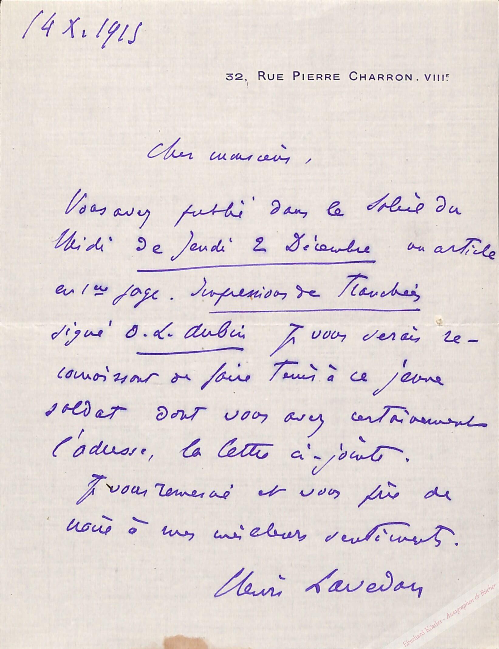 Bittet um die Adresse des jungen Soldaten O. L. Aubin, der einen Beitrag in „Le Soleil“ veröffentlicht hatte. – Lavedan wurde 1898 in die Académie française aufgenommen.