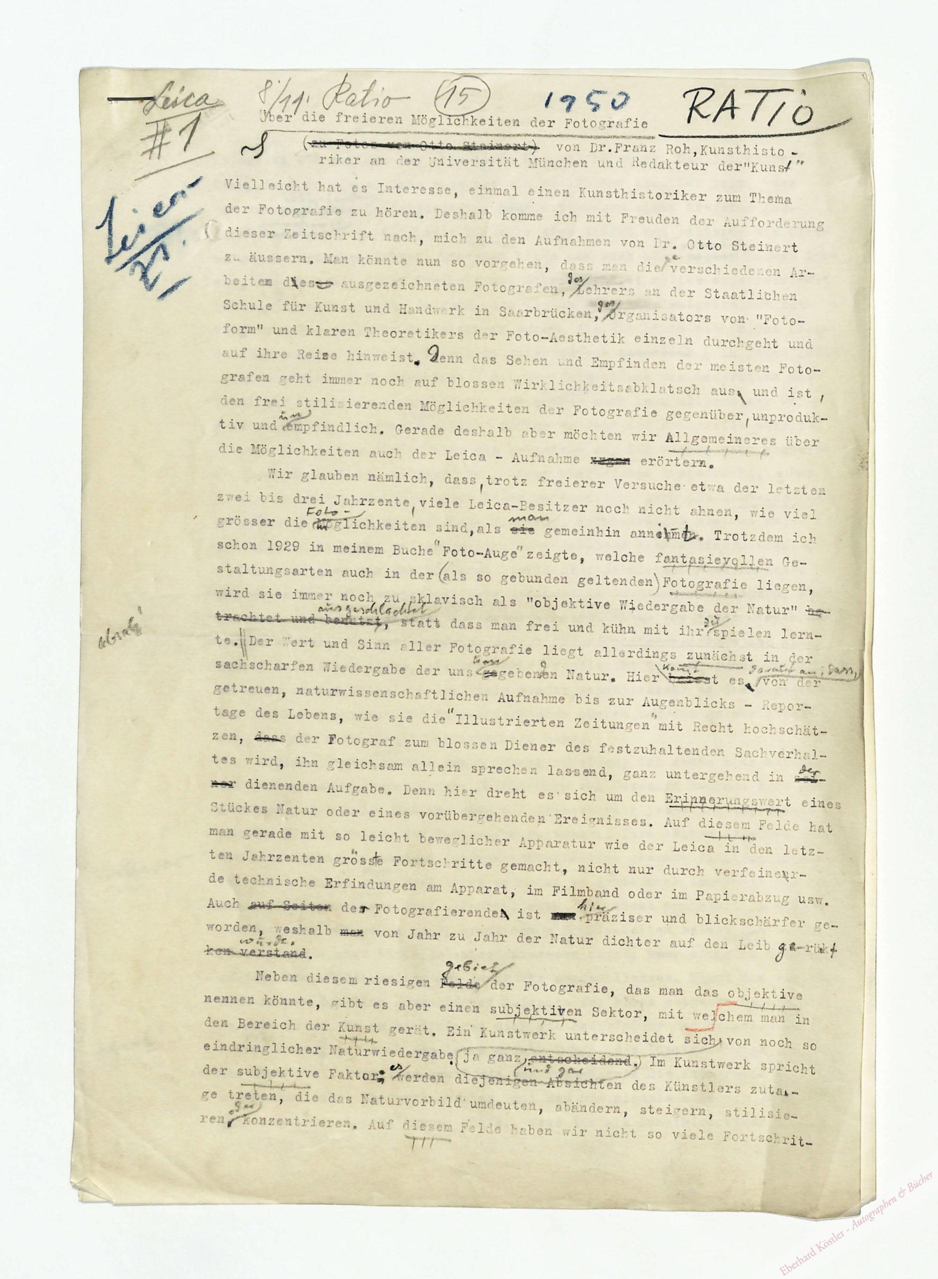 „Über die freieren Möglichkeiten der Fotografie.“ Aufsatz über die Arbeiten des Fotografen Otto Steinert (1915-1978) für die Zeitschrift „Leica-Fotografie“ (4. Jg., 1951, Heft 1). – Mit Satzvermerken.