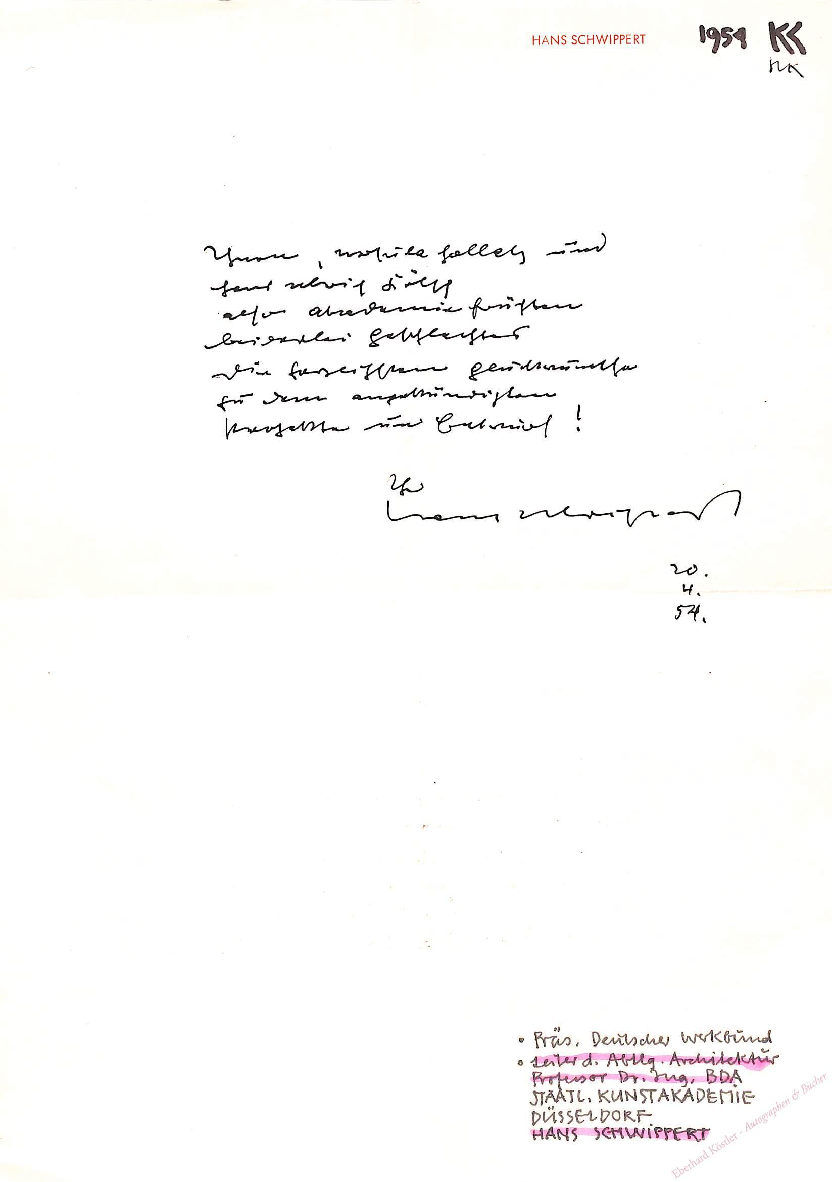 An Hans Ulrich Kölsch und dessen Ehefrau Ursula Kölsch-Hollatz: „Glückwünsche zu dem angekündigten Projekte und Entwurf …“ – „… herzlichste Glückwünsche zur Hochzeit mit soviel Baukunst …“ – Hans Ulrich Kölsch (1927-2019) war Begründer der Deutschen Gesellschaft für Kunststoffgeschichte e.V. und Sammler historischer Kunststoffgegenstände. – Schwippert arbeitete seit 1924 im Berliner Bauatelier von Erich Mendelsohn, lernte 1925 Mies van der Rohe kennen und wurde 1930 Mitglied im deutschen Werkbundes, 1944 wurde er von den Amerikanern als einer von neun „Bürgermeistern“ der Stadt Aachen eingesetzt, an deren Wiederaufbau er ebenso maßgeblich beteiligt war wie an der Neuausrichtung der Staatlichen Kunstakademie in Düsseldorf. Mit dem Bonner Bundeshaus (1949) und dem Bundeskanzleramt im Palais Schaumburg (1950) prägte er die architektonische Moderne der Nachkriegszeit.