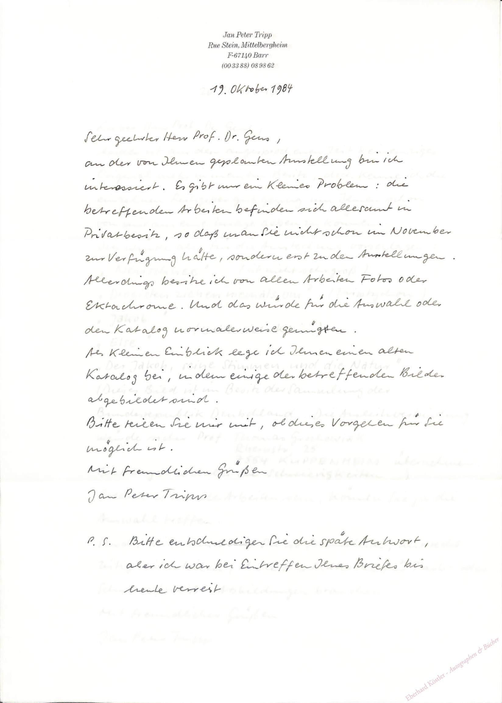 An einen Verleger wegen einer Ausstellung und üner mögliche Leihgaben. – Tripp gilt als wichtiger Vertreter des Realismus.