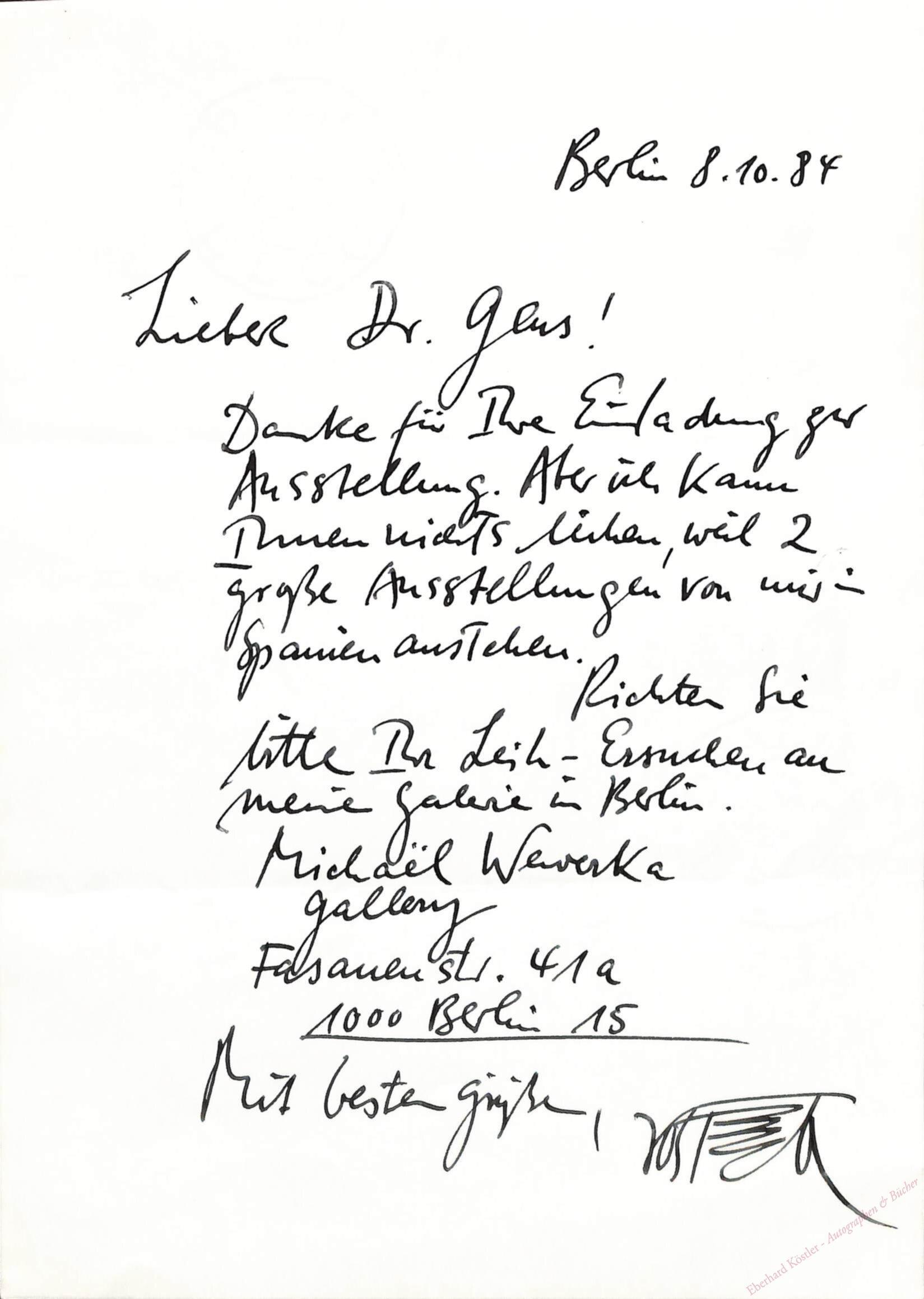 An einen Verleger: „[…] Danke für Ihre Einladung zur Ausstellung. Aber ich kann Ihnen nichts leihen, weil 2 große Ausstellungen von mir in Spanien ausstehen […]“ Empfiehlt seine Berliner Galerie Wewerka. – Beiliegend ein Prospekt für sein Graphikwerk „Metamorphosen“.