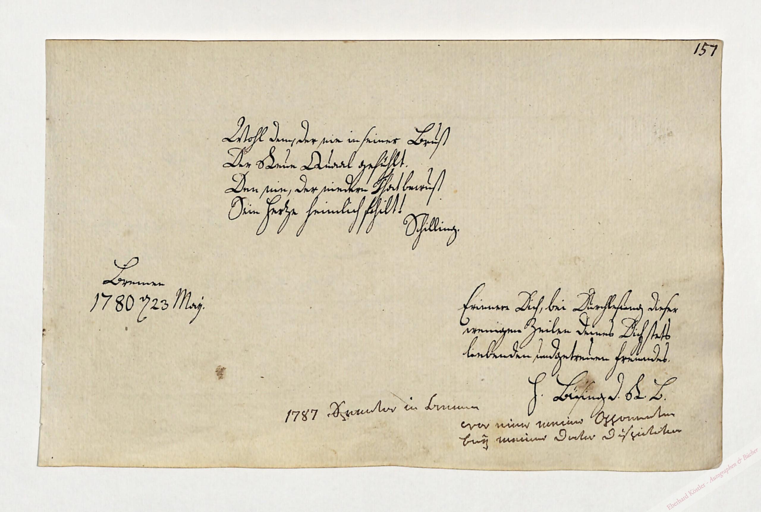 Eigenhändiges Albumblatt mit Unterschrift Bremen, 23. V. 1780, Qu.-8°. 1 Seite.
