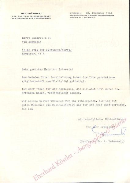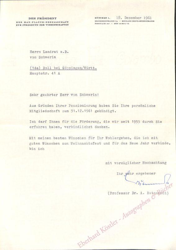 Als Präsident der Max-Plank-Gesellschaft wegen die Kündigung der Mitgliedschaft an Hans-Bone von Schwerin in Bad Boll. Als Präsident der Max-Planck-Gesellschaft setzte sich Butenandt von 1960-72 mit Weitblick, Geschick und Überzeugungskraft für Institutsgründungen und die Errichtung von modernen Neubauten sowie für notwendige Umstrukturierungen ein.