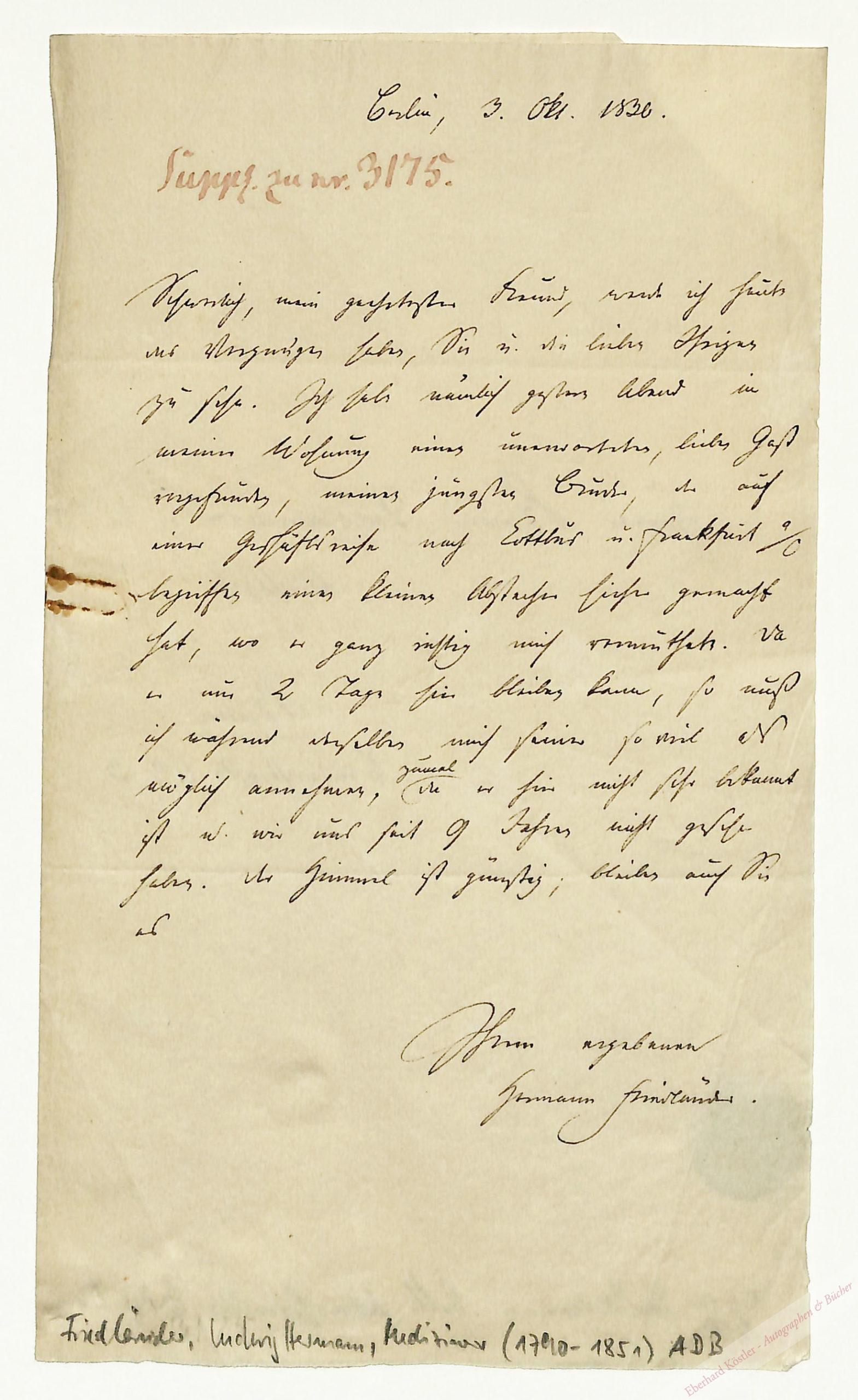 An den Kunsthistoriker Benoni Friedländer (1773-1858) in Berlin. Absage einer Einladung, da er in Berlin unerwartet Besuch von seinem Bruder erhalten habe, den er lange nicht gesehen habe und der auf einer Geschäftsreise nach Cottbus und Frankfurt/Oder begriffen sei. – Friedländer kam 1815 in Begleitung des Malers Philipp Veit nach Italien, wo er vorwiegend in Künstlerkreisen verkehrte, und legte die Eindrücke dieses Aufenthalts in seinen Ansichten von Italien (1818-20) dar. 1817 kehrte er nach Deutschland zurück, habilitierte sich an der Univ. Halle und wurde dort 1819 Professor der theoretischen Medizin.