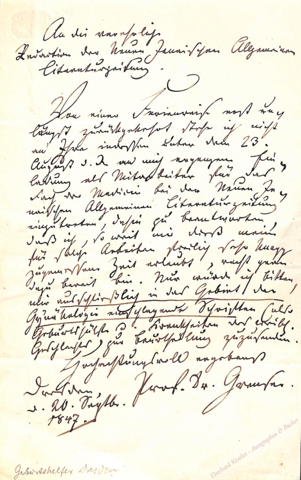 An die Redaktion der Neuen Jenaischen Allgemeinen Literaturzeitung, der er gerne als Mitarbeiter beitritt: „Nur würde ich bitten, mir ausschließlich in das Gebiet der Gynäkologie einschlagende Schriften […] zuzusenden […]“ – Grenser folgte 1845 dem Ruf als Professor für Geburtshilfe sowie als Direktor des königlich-sächsischen Entbindungsinstituts an die Chirurgisch-medicinische Akademie nach Dresden. Zusammen mit Professor Haase behandelte Grenser im März 1846 den kleinen Karl May, von dessen Augenleiden er durch Mays Mutter wusste.