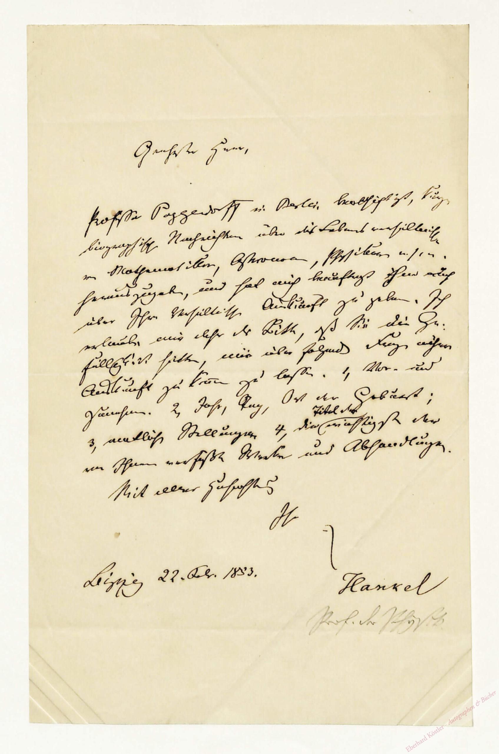 „[…] Professor Poggendorff in Berlin beabsichtigt, kurze biographische Nachrichten über die Lebensverhältnisse von Mathematikern, Astronomen, Physiker u.s.w. herauszugeben, und hat mich beauftragt Ihm auch über Ihre Verhältnisse Auskunft zu geben. Ich erlaube mir daher die Bitte, daß Sie die Gefälligkeit hätten, mir über folgende Fragen nähere Auskunft zu kommen zu lassen. 1.Vor- und Zunahmen. 2. Jahr, Tag, Ort der Geburt; 3. amtliche Stellungen, 4. die Titel der wichtigsten der von Ihnen verfaßten Werke und Abhandlungen […]“ – Hankel war Lehrer an der Realschule der Franckeschen Stiftungen in Halle und wurde 1847 Prof. der Physik an der Universität Leipzig. Der erste Band von J. C. Poggendoffs „Biographisch-Literarischem Handwörterbuch zur Geschichte der exacten Wissenschaften“ erschien 1863.