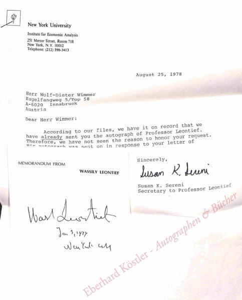 Leontief erhielt 1973 den Alfred-Nobel-Gedächtnispreis für Wirtschaftswissenschaften. – Ein masch. Brief des Sekretariats von Leontief als Beilage.