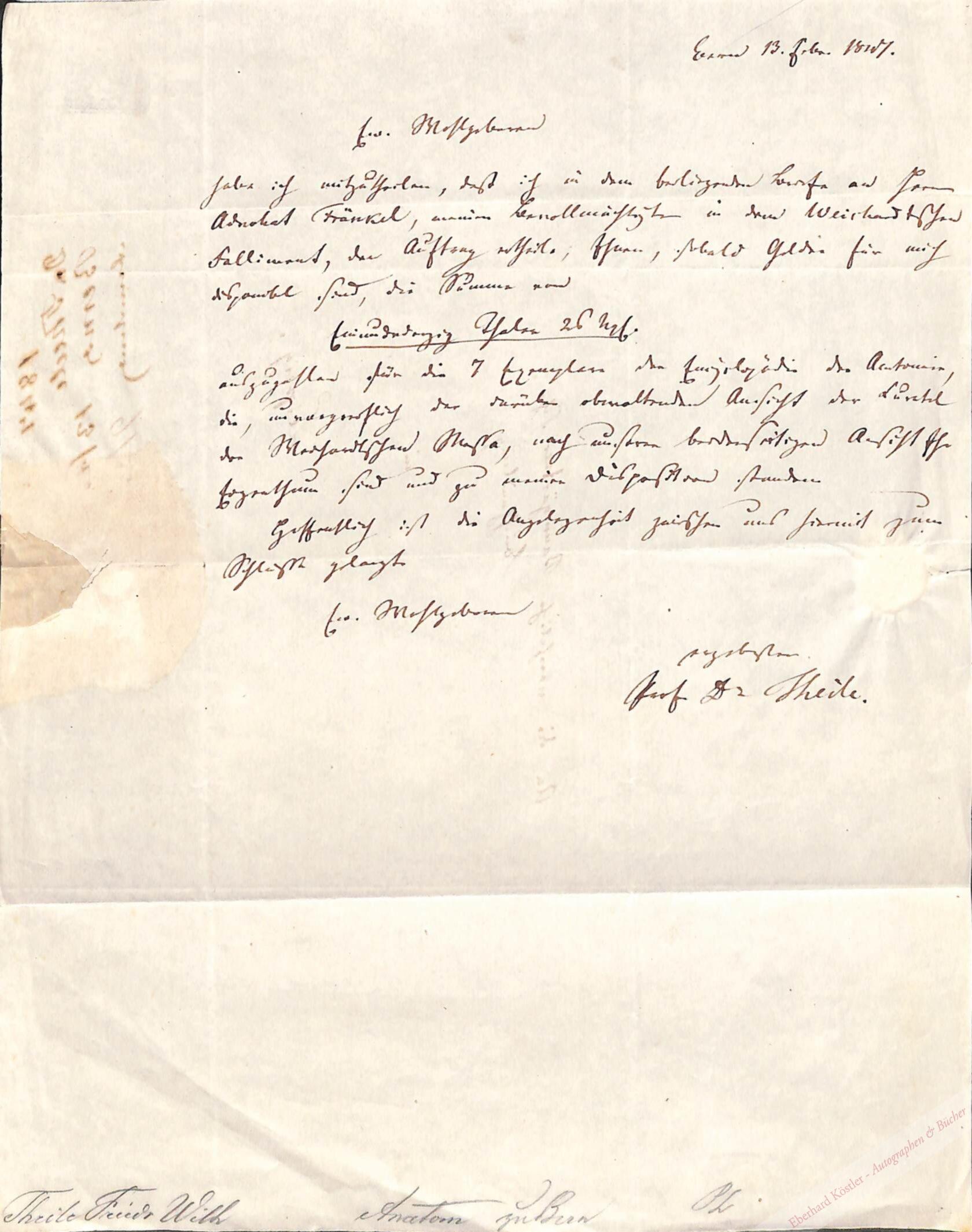 An die Baumgärtnersche Buchhandlund in Leipzig wegen einer Zahlung für 7 Exemplare der Enzyklopädie der Anatomie. – Theile lehrte in Jena. 1834 nahm er einen Ruf als Professor für Anatomie an die neu gegründete Universität Bern an.