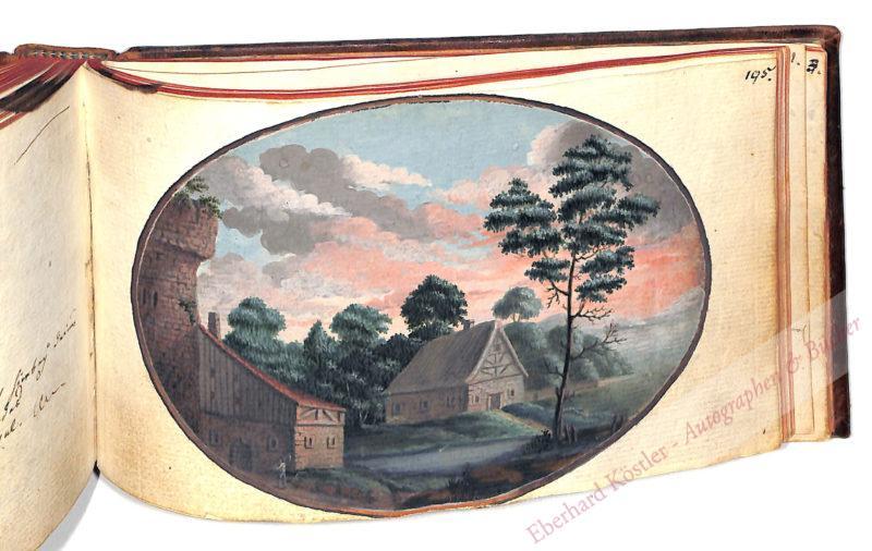 „Stammbuch meines sel. Großonkels Gotthold Winkler, später Pastor zu Lohne a. a. Leine b/ Altenburg. Meine liebe Tante Marie Winkler, Tochter meines Großonkels, dedizierte mir dieses Büchlein am 14. Februar 1895. Paul Winkler, z. Z. Lehrer i Ronneburg“ (Zuschreibung auf dem Vortitel). – Gotthold Winkler stammt aus der alteingessenen Orlamünder Familie, studierte in Jena und Leipzig. Mit zahlreichen Eintragungen aus der Familie, u.a. von dem Apotheker Christian Friedrich und dessen Bruder Johann Friedrich Winkler, sowie schönen ländlichen Szenen (Sonnenuntertag, Burg) und Freundschaftstempeln. Die Eintragungen teils in Latein, Griechisch und Französisch und mit kalligraphischen Verzierungen.