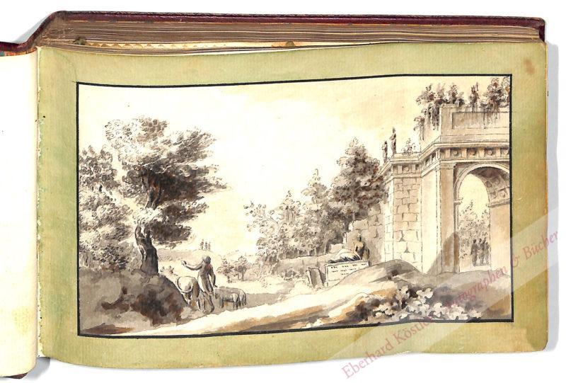 Sehr hübsches Stammbuch aus Frankfurt und Usingen. – Titelblatt: „Meinen Freunden und Gönnern gewidmet Johann Daniel Garkoch“. Unter den Beiträgern: P. Jung („architect et Dessinadere de la Cour de Mayence“), Christoph Hartmann Hiltebrand, Heinrich Joseph Seidenberger, Carl Joseph Gregory de Wehrheim, Conrad Eckhard, Samuel Heß, J. D. Heidelbach aus Göttingen, Justus Friedrich Hiltebrandt, M. M. Vogtin aus Trarbach, A. C. Hildebrand, A. M. Hiltebrandt, Joh. Huld. Hiltebrandt („Rector in Usingen“), G. F. Dombois (Mit Silhouette in farb. Tuschrahmen), Johann David Wagner, Friedrich Jacob Reiz, Chr. Jac. Graff, Christoph Hartmann Hiltebrandt, Peter Carl Vietor, Johann Philipp Duhmer, Joh. Jacob Bayn, Jo. Georg Rudel, R. Wuillemier aus Neuchatel, Philipp Daniels, Georg Cap. Hein, Joh. Heinr. Casselman, J. V. Kiesel, A. Thieme von Lübeck. – Einige Blätter wurden herausgetrennt. – Viele der Beiträger findet man in: R. und M. Kaethner: Usingen. Menschen und Erlebnisse aus der Geschichte einer kleinen deutschen Stadt. Usingen 1981. – Von schöner Erhaltung.