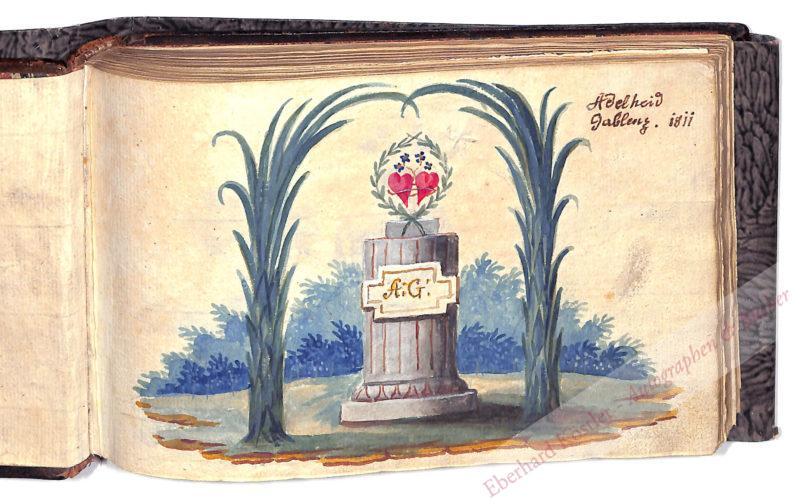 Dekoratives Stammbuch aus dem schlesischen Jägerndorf und den umliegenden Rittergütern, mit reizenden Stickereien, Paillettenapplikationen und Aquarellen, darunter eine aquarellierte Ansicht „Görtz im Aprill 1821“ sowie verschiedene fein ausgeführte Freundschaftstempel in eher ungewöhnlichen Motiven. – Mit einem Eintrag des Politikers und Juristen Eduard Gottlob von Nostitz und Jänckendorf (1791-1858), datiert „Jägerndorf 1. 12. 14“. Eduard von Nostitz war der Bruder des Landtagsabgeordneten Julius Gottlob von Nostitz und Jänkendorf und Sohn des sächsischen Konferenzministers Gottlob Adolf Ernst von Nostitz und Jänkendorf. 1813 trat er in preußische Dienste ein, zunächst als Offizier der Armee, dann als Amtshauptmann und Kammerkreditkassen-Kommissar in Dresden und Pirna rechts der Elbe. Von 1845 bis 1847 war Nostitz Mitglied des Staatsrats, bis 1850 Richter am Staatsgerichtshof, von 1833/34 und 1854 bis 1858 Mitglied der I. Kammer des Sächsischen Landtags und in Dresden Mitglied der Freimaurerloge Zum goldenen Apfel. Weitere Eintragungen u.a. von Max von Hallegg „Lieutnant bey Kaiser-Jäger“, Lorenz von Rathgeber „Lieutnant“, Lyrheim „Chefarzt im 4ten Jäger-Bataillon“, Aloys Edler von Calingsberg und Joseph Carl Nicolay „Lieutnant im K.K. 4ten WaldJägerBataillon“. – Sehr gut erhalten.