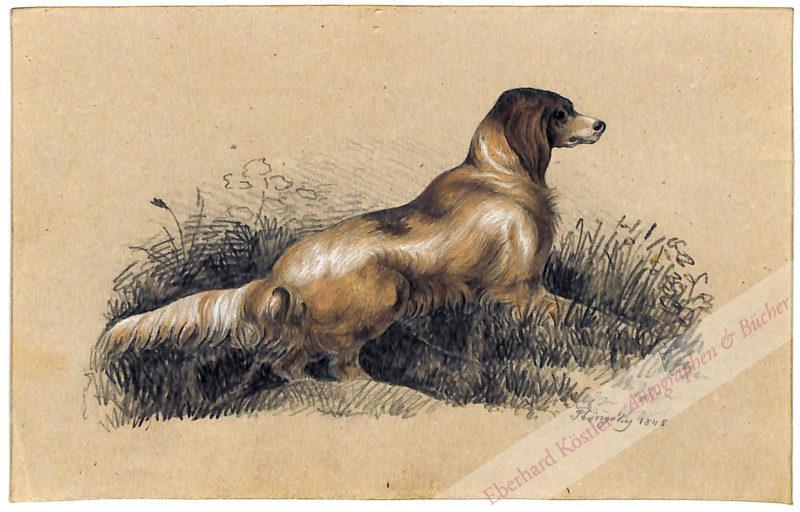 Stammbuch des österreichischen Arztes und Klimatologen Rudolf Johann N. D. Edler von Vivenot (1833-1870), mit einem 8-taktigen Notenzitat des belgischen Komponisten und Violonisten Charles Auguste de Bériot (1802-1870): „J’ai écrit cette marche pour mon ami Rodolphe le 3 oct. 1848, en souvenier de moi C. de Bériot“. – Ferner ein fein ausgeführtes Aquarell eines ungarischen Husaren zu Pferde mit ungarischer Widmung und Unterschrift von „Wajdag“ und kunstvollen Bleistiftzeichnungen von J. v. Frankl (liegender Knabe), Hönysky (Jagdhunde) und J. Marechal (2 Hunde als Gentlemen verkleidet spielen Karten, umsorgt von einem als Hausmädchen gekleideten Schaft). Weitere Beiträge in deutscher, französischer, englischer und ungarischer Sprache von: Emmy Knorr (München 5. X. 1849), Fanny Voigt (Wien 11. VII. 1851), Charles de Marchthal, Adolf Löwinger (Wien 27. III. 1852), Szontágh Abrichs (22. VII. 1852), Antonio Coelho de Sa’c Albuquerque, Walburga Vivenot (die Großtante) u.v.a. – Rudolf von Vivenot, Sohn des gleichnamigen Wiener Arztes und Enkel des Wiener Arztes Dominik von Vivenot, der sich in der Zeit der Choleraepidemie um Wien verdient machte, war seit 1862 Privatdozent und seit 1868 Professor an der Medizinischen Fakultät der Universität Wien. – Bériot, beeinflusst von Niccolo Paganini, war Kammerviolinist König Charles X. von Frankreich und König Wilhelm I. der Niederlange, zu denen zwischen 1815 und 1829 auch Belgien gehörte. – Schönes Album mit bedeutenden Einträgen.