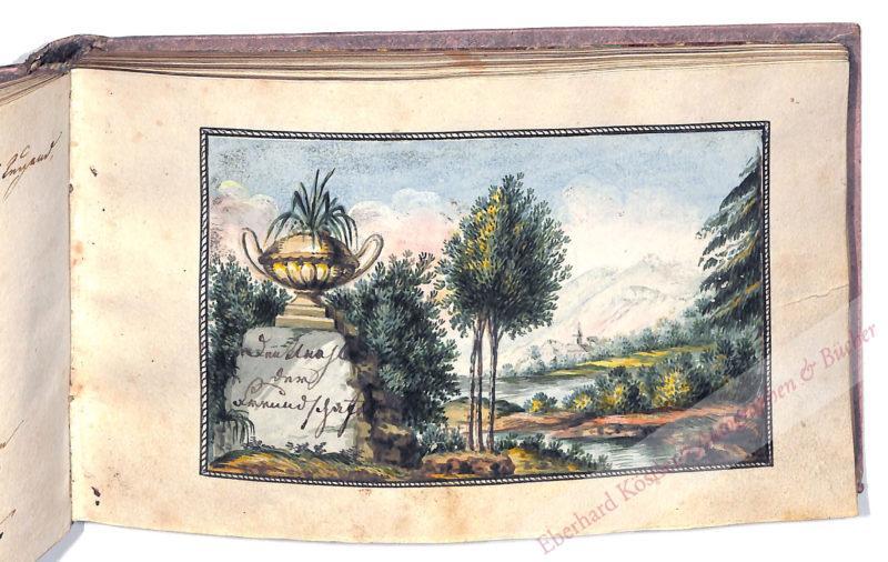 Mit 10 altkolorierten Kupferstichen aus dem Verlag Riedel in Nürnberg, daunter ländliche und gesellschaftliche Motive, Freundschaftstempel, teilweise betitelt: „Nicht blos für diese Unterwelt“, „Hinaus hinaus ins rasche Leben“, „Der Schöpfer wollte die Menschen beglüken“, „Ewig sey gefesselt mit Rosen“, „Lebe wohl! im fernen Lande“, „Wer da? rufet Amor hier“. – Das Freundschaftsalbum stammt aus der Familie Wagner in Ratibor, die Einträge meist aus dem Bekannten- und Familienkreis. Der Vater G.A. hat 7 Stammbuchblätter seinen Kindern gewidmet: „An meine Tochter Ernestine“ (Ratibor 6. VI. 1823), „An meinen Sohn Theodor“ (Ratibor 23. X. 1825), „An meinen Sohn Guido zur Erinnerung“ (Ratibor 29. VII. 1829), „An meinen Sohn Theodor“ (Ratibor 23. X. 1825), „An meinen Sohn Guido“ (Ratibor 30. XI. 1861), „An meine Enkelkinder“ (Ratibor 30. XI. 1861), „Am Grabe bei meinem Sohn Guido – Am allerseelen Tage 1862 von deinem Vater G. A. Wagner“. – Dekoratives Stammbuch.