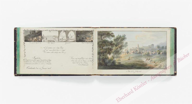 Unter den Beiträgern finden sich drei Mitglieder der Familie Frommel, dabei ein Doppelblatt von Carl Ludwig Frommel (1789-1863): Über dem Eintrag (dat. Karlsruhe, 15. Januar 1808) 4 kleine szenische Aquarelle und eine Girlande in Federzeichnung, rechts ein ganzseitiges Aquarell mit Landschaft und Stadt im Hintergrund, im Mittelgrund zwei Reiter, bezeichnet „Am 6ten Juli 1807“. Es handelt sich um eine Ansicht vo Baden-Baden. – Frommel studierte ab 1805 Malerei und Kupferstich in Karlsruhe. Einer seiner Lehrer war Christian Haldenwang (1770-1831). Wohl von diesem stammt ein weiteres mont. Aquarell mit einer Gebirgslandschaft und eigenh. Bezeichnung „Zum freundschaftlichen Andenken von Haldenwang. Carlsruhe d. 15 Jan: 1808“. Als weitere Bildbeigaben enthält das Stammbuch: montierte Deckfarbenmalerei als Titelbild (Freundschaftsdenkmal, monogr. C.M.I.), mont. Deckfarbenmalerei in Sepia (Felslandschaft, quadratisch), aquarellierte Architekturzeichnung von Joh. Ferd. Hodel (Front eines Tempels) sowie Stickbild. – Stellenw. schwach stockfleckig. Das Aquarell von Haldenwang mit leichten Leimflecken.