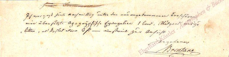 Eigenh. Schriftstück mit Unterschrift „ergebener Brentano“. , Ohne Ort und Jahr (ca. 1830), Schmal-Qu.-8° (5 x 19 cm). 1 Seite.