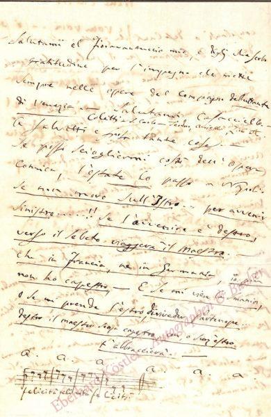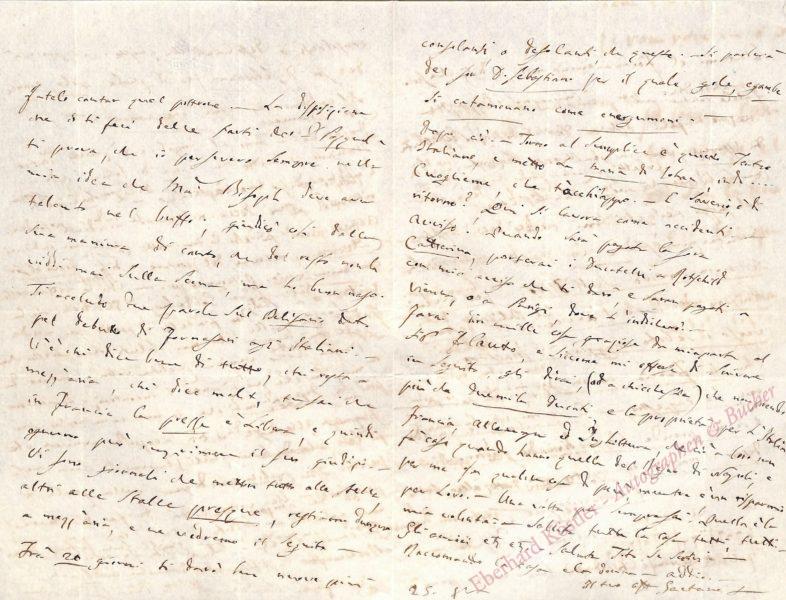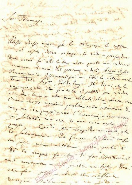 „Sor Tommaso | Adesso adesso ricevo per la Diligenza la cassetta col resto delle richezze che vado a profondere. Due giorni fà ebbi la tua nelle quale non indicavi nemmeno il nome del portore, e dissi, bravo el sor Tommasuccio. Riscenderò poi. – Ellà la Lettera […] della Sign. Goldeberg [Fanny Goldberg]. Gli dirmi che la ringrazio; che suo fratello è partito per Londra e le stà bene – che miei saluti sua sorella che l’anno scorso veniva qualche volte a cantare da me, ma che quest’anno l’incontrai, e nemmeno mi salutò, ma che io non ce ne voglio per questo. – Credo già Leopoldo arrivera, e te la salutarai – Da Genova ti sarà messa in posta una lettera nella quale ti dò le ampie facultà di far rispettare il mio contratto – se quella non. Basta. Dirmi che far posso. – Sento che [Luigi] Lablache [baritono] dunque stà bene, e ne […]. – [pag. 2:] fatelo cantar quel poltrone. – La dispositione che io ti faci delle facti del D Pozzenda [?] ti prova, chel io persevero sempre nella mia idee che Mad. [Anna] Bishop [sopran] deva aver talenti nel buffo; giudico così dalla maximi di canto, che del raffo non la viddi mai sulla scena, ma ho buon naso. Ti accento due parole sul Belisario dato pel debuto di Fornasari [Tenor] agli Italiani. – V’è chi dice bene di tutte, chi resta a mezz’aria, chi dice male, tensai che in Francia la pressa è libera, e quindi ogenno però impressione il suo giudici. – Vi sono giornali che mettra tutto alle stelle, altri alle stalle presque, restiamo dunque a mezz’aria, e ne vedremo il seguito. – Tra 20 giorni si darò bene […] più [pag. 3:] consolandi, o desolandi, que queste – di parlerà del su D. Sebastiano per il quale […], egambe si catamenano come energameni. – Dopo ciò. – Torno al semplice è questo Teatro Italiano, e metto la Maria di Rohan, in di …. Cuoglieme, che t’acchiazzero. – E sa´reni, è di ritorno? Qui si lavora come accidenti. – Avviso! Quando sarà pagato la sera Catterina, porterai i Ducatelli a Rothschild con mio avviso che ti darò, e favore pagati a Vienna, o a Parigi, dove t’indicare? – Farai dire mille cose graziosa die mia posta al Sigr. [Vincenzo] Flauto, e siccome mi offerse di scrivere in seguito, gli dirai, (ed a eticchessa) che non prendo più che due mila Ducati, e la proprietò per l’Italia, Francia, Allemagna ed Inghilterra, che ciò a loro non su casa quando hanno quella del Regno di Napoli, eper me fa qualque cose di però, mentre è non rispararmi per loro. – Una volta per sempre sai! Quella è la mia volontà. – Salute tutte le cose tutti, tutti gli amici etc. etc. – Saluti Tito se senrir. – Raccomando la casa e la donna – addio. – Il tuo aff Gaetano D. | 25. gen. [pag. 4:] Salutami el Fioravantuccio mio, de digli che serlo gratitudine per l’impegno e le ricette sempre nelle opere del campagna debuttanta di Venezia. – Salutami Casaciello. – [Filippo] Coletti in S. Carlo – Teodero, Anielli, [Lorenzo] Zino etc. A Salvietti e sposa tante case. – Se posso sciogliermi così dell’opera comica, l’estate lo passo a Napoli. Se non moro sull’Istro … per avvenir sinistro …..!! Se l’avvenira è destro, verso il Sabato viaggerà il Maestro. – Che in Francia, ne in Germania, io piu non ho capestro, – E se mi vien la smania, o se mi prende l’estro, divinender Partnenope … destro il maestro senza capestro, con, o senz’estro t’abbraccierà. – A. A. A. A. A. A. [Noten] felicità felicità felicità.“ Großartiger musikalischer Brief an seinen Freund Tommaso Persico, am Schluß mit einem 4-taktigen Notenzitat auf den Text „felicità, felicità, felicità“, einer in italienischen Opern etwa von Rossini und Cimarosa verwendeten Kadenz, die Donizetti bereits in einem Brief an Simone Mayr aus Paris 8. April 1839 zitierte. – Umfangreicher Brief des Komponisten über seine Projekte für das laufende Jahr. Er pendle zwischen mehreren Aufführungen in Paris, Wien und Neapel, London, Genua und Venedig, wobei er sich Sorgen mache, geeignete Interpreten zu finden. Donizetti erwähnt seine Opern „Belisar“, „Don Sebastien“, „Marie de Rohan“ und „Caterina Cornaro“. Er möchte zwei junge Leute mitnehmen, von denen er gesprochen habe, von denen er jedoch keine genauen Angaben hat. Er habe den Brief von Signora Goldberg erhalten, für den er sich bedanken möchte. Sie habe ihm geschrieben, dass ihr Bruder nach London abgereist sei, dass es ihr gut gehe und sie vorschlage, für ihn zu singen. Donizetti informiert Persico auch über einen Vorschlag zu einen Vertrag mit Genua. Er diskutiert verschiedene Interpreten, von denen einer Talent für die Opera buffa hat, obwohl sein Gesangsstil auf der Bühne nicht überzeuge. Für die italienische Premiere müsse er zwei Textpassagen von „Belisar“ verändern. Er weiß nicht, ob die Aufführung gut oder schlecht werde, aber er vermutet, dass die französische Presse frei sei. Seit dem 20. Januar plane man eine Aufführung von „Don Sebastian“. Donizetti geht ausführlich auf seine Oper „Marie de Rohan“ am „Theatre des Italiens“ ein. Er wisse nicht, ob er sich besser in Paris oder Wien niederlassen solle und möchte das gerne mit Rothschild besprechen. Er hofft, 2000 Dukaten aus einem Grundstücksverkauf in Neapel zurückzuerhalten. – Ungedruckter prachtvoller Brief. – Italienische Transkription auf Anfrage. – Selten.