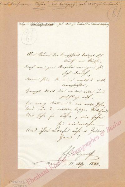 Die letzte Strophe eines seiner berühmtesten und oft zitierten Gedichte, „Am Baum der Menschheit“, erstmals erschienen in „Ein Glaubensbekenntnis. Zeitgedichte“ (1844, S. 125ff.): „Am Baum der Menschheit drängt sich Blüth an Blüthe, | Nach ewgen Regeln wiegen sie sich drauf; | Wenn hier die eine matt und welk verglühte, | Springt dort die andre voll und prächtig auf. | Ein ewig Kommen und ein ewig Gehen, | Und nun und nimmer träger Stillestand! | Wir sehn sie auf-, wir sehn sie niederwehen – | Und ihre Loose ruhn in Gottes Hand! […]“ – Bei der Erstveröffentlichung in der „Kölnischen Zeitung“ hatte die Zensur den dritten und vierten Vers der zweiten Strophe beanstandet. Das Gedicht enthält auch freimaureisches Gedankengut (vgl. Kohut, Berühmte Freimaurer, 1911, S. 137). – Am Oberrand Zuschreibung von alter Hand.