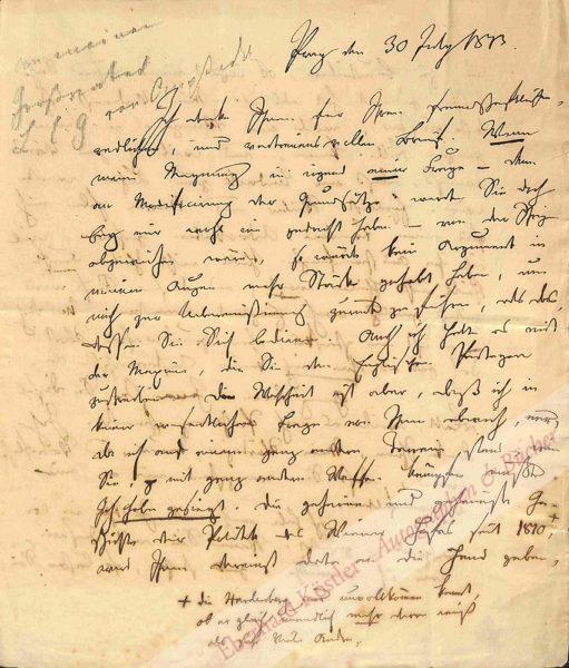 Wichtiger politischer Brief. – Vor der Völkerschlacht bei Leipzig an den hannoverschen Diplomaten in England und späteren Minister Ludwig Carl Georg von Ompteda (1767-1854), den er regelmäßig mit geheimen Nachrichten versorgte: „[…] Wenn meine Meynung in irgend einer Frage – denn an Modificirung der Grundsätze werden Sie doch bey mir wohl nie gedacht haben – von der Ihrigen abgewichen wäre, so würde kein Argument in meinen Augen mehr Stärke gehabt haben, um mich zur Übereinstimmung zurück zu führen, als das, dessen Sie sich bedienen. Auch ich halte es mit der Maxime, die Sie den Englischen Parteyen zuschreiben. Die Wahrheit ist aber, daß ich in keiner wesentlichen Frage von Ihnen abwich, nur, da ich auf einem ganz andern Terrain stand wie Sie, mit ganz andern Waffen kämpfen mußte. Ich habe gesiegt. Die geheime und geheimste Geschichte der Politik des Wiener Hofes seit 1810, die Hardenberg nur unvollkommen kennt, ob er gleich unendlich mehr davon weiß als sehr Viele Andre, wird Ihnen dereinst Data an die Hand geben, um zu beurteilen, ob irgend einer unserer Sache besser gedient hat als ich. Mein Verdienst ist desto größer, weil nur Wenige es in seiner ganzen Fülle kennen, und weil ich zum Voraus weiß, daß mir Undank zum Lohn werden wird. Exaltirte Weiber und Narren haben mich für einen Friedens-Advokaten gehalten, weil ich ihre Ausschweifungen theils nicht theilen durfte, theils nicht theilen mogte; und dieser Ruf wird zeitig genug nach England wandern. Und doch – es ist ein starkes, aber grundwahres Wort – doch gab es ohne mich keinen Oesterreichischen Krieg. – Genug davon – Zerreißen Sie dieses Blatt, weil es nach Prahlerey schmeckt. Ich danke Ihnen, Mein würdiger, treuer, und vortrefflicher Freund, daß Sie wenigstens nie an mir verzweifelten […]“ – Gentz digital Nr. 911 (H: nicht ermittelt. D: Ompteda-Nachlaß, VI, Nr. 81, 179.). – Gentz war als Publizist und Staatstheoretiker Berater Metternichs. – Einriss im Falz.