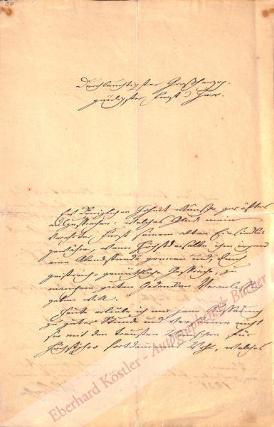 Prächtiger Geburtstagsbrief an Großherzog Carl Friedrich von Sachsen-Weimar-Eisenach (1783-1853): „Durchlauchtigster Großherzog, gnädigster Fürst und Herr. Ew. Königlichen Hoheit Wünsche gar öfter auszusprechen: welches Glück mein Verehrter Fürst seinem alten Einsiedler gewähre, wenn Höchstderselbe ihm irgend eine Abendstunde gönnen und, durch geistreich-gemüthliche Gespräche, zu manchem guten Gedancken Veranlassung geben will. Heute erlaube ich jene Äußerung zu guter Stunde und versäume nicht, sie mit den treusten Wünschen für Höchstihro fortdauerndes Wohl, welches auf Dero Familien- und Landeskreis sich freudig erstrecken möge, zu begleiten und wage zugleich die angelegentlichste Bitte: die mir bisher verliehene Gunst und Gnade möge meinen übrigen Lebenstagen, zu Erheiterung und Erquickung derselben, unwandelbar zugesichert bleiben. Unter den aufrichtigst Angehörigen nicht der Letzte. Verehrend und Vertrauend. Ew. Königlichen Hoheit unterthänigster treugehorsamster Diener J. W. v. Goethe.“ – Brief zum 2. Februar, dem Geburtstag des Großherzogs Carl Friedrich. Der älteste Sohn Carl Augusts, dessen Geburt Goethe 1783 in einem Gedicht gefeiert hatte, verlebte seine Jugend in nahem Umgang mit Goethe. Nach seiner Heirat mit der russischen Großfürstin Maria Pawlowna 1804 übernahm er nach dem Tod seiner Vaters 1828 die Regierung. Er war es auch, der 1832 die Bestattung Goethes in der Weimarer Fürstengruft neben Carl August anordnete. – Unser Brief findet auch in Goethes Tagebuch Erwähnung. Am Ende eines ereignisreichen Tages empfängt er seine Enkel, die von „dem Kinderdiner zum Geburtstag des Großherzogs“ kamen. Anschließend diktierte er das Konzept zu unserem Brief seinem Schreiber John, korrigiert es (vgl. GSA 29/50, Bl. 27) und führte die eigenhändige Reinschrift aus: „Serenissimo, Schreiben zur Gratulation des Geburtsfestes.“ (WA III, Bd. 13, S. 23). – Druck: WA IV, Bd. 48, S. 106 f., Nr. 97 (nach dem Erstdruck 1855). – Zuletzt versteigert bei Stargardt 23.-28. X. 1905, Nr. 1167. – Falzeinrisse alt hinterlegt.
