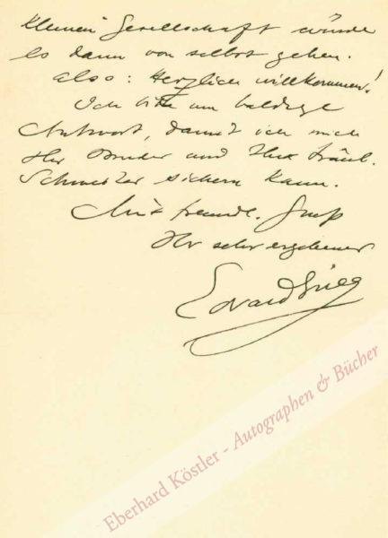 An den Cellisten Julius Klengel, den er mit Frau, Bruder (der Dirigent Paul Klengel) und Schwester zu einem Diner einlädt: „[…] Das letzte Mal, wo wir zusammen waren, fand ich so überaus hübsch, dass ich mich nach einer Wiederholung sehne. Würden Sie und Ihre Frau Gemahlin uns wohl die Freude machen, am Mittwoch den 16ten mit uns zu diniren, z. B. um 3 Uhr und zwar im Restaurant Paege, Hainstrasse? Oder passt Ihnen ein anderer Tag in der Woche, z. B. nach Mittwoch vielleicht besser? Jedenfalls hoffen wir sehr auf das Vergnügen. Ihr Bruder Dr. K. hat mir gesagt, die Hauptsache wäre, dass Sie nur können. Mit den übrigen Klengelschen Mitglieder der kleinen Gesellschaft würde es dann von selbst gehen. Also: Herzlich willkommen! Ich bitte um baldige Antwort […]“ – Grieg, der von 1858 bis 1862 am Leipziger Konservatorium Klavier studiert hatte, nutzte zeitlebens zahlreiche Gelegenheiten zu Aufenthalten in der Stadt und verbrachte in der Konzertsaison oft mehrere Wochen in Leipzig. Das Restaurant Päge am Markt galt als das beste der Stadt.