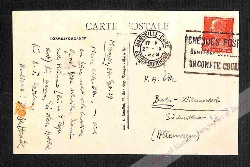 An seinen Freund P. A. Otte in Berlin-Wilmersdorf, den Redakteur des Berliner Tageblatts aus Marseille, das Horváth auf der Rückreise von Barcelona besuchte, wo er die Weltausstellung angesehen hatte: „Mein lieber Otte, – auch von hier recht viele herzliche Grüße! Bitte schreiben Sie mir nach Murnau (bin in 4 Tagen dort) bis wann Sie den Artikel für B[erliner] T[ageblatt] brauchen. Herzlichst: Ihr Ödön Horváth.“ Bildmotiv: „Marseille – Le vieux Port au vu des quai des Belges“. – Ein Artikel Horváts über die Weltausstellung im „Berliner Tageblatt“ ist nicht bekannt, dafür hat er seine Reiserefahrungen im Roman „Der ewige Spießer“ (1930) verarbeitet, wo der junge Alphons Kobler von München zur Weltausstellung 1929 in Barcelona aufbricht, um sich zwecks Zukunftssicherung eine reiche Frau zu angeln. – Kleiner (Kaffee-)Fleck zwischen Grußwort und Unterschrift. – Sehr selten.